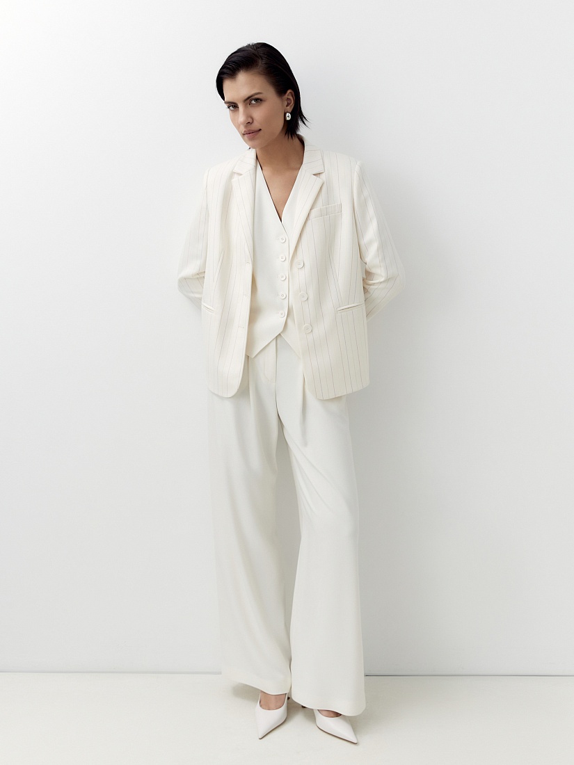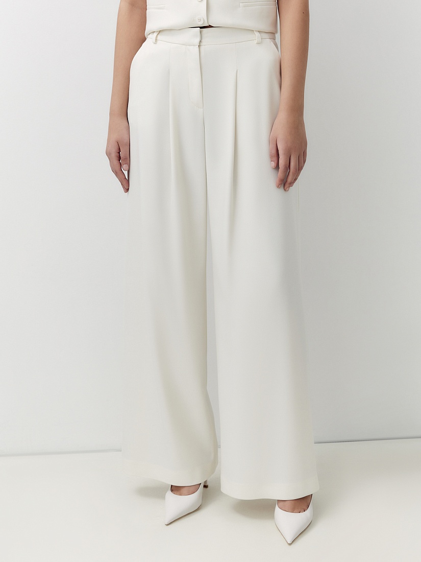 Прямые широкие брюки со складками на высокой посадке с притачным поясом. Брюки выполнены из костюмной ткани с добавлением вискозы молочного цвета. Имеют два функциональных кармана по бокам. На спинке есть резинка.