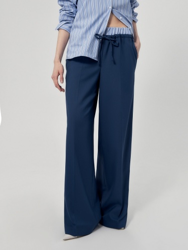 Широкие брюки на резинке и кулисе из костюмной ткани темно-синего цвета. Составит идеальный комплект с укорочённым жилетом из одной ткани.