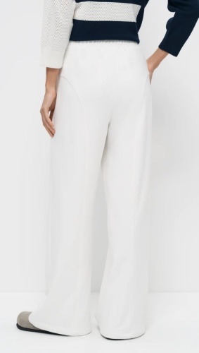 Брюки полной длины изготовлены с хлопковым составом, что делает их мягкими и удобными для повседневной носки. Цвет брюк – «ванильный зефир» – яркий и насыщенный, напоминающий сладость. В поясе брюк расположена лента, декорированная авторским принтом, на котором написаны имена различных стихий