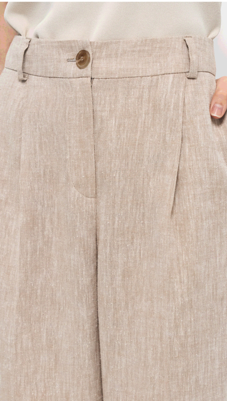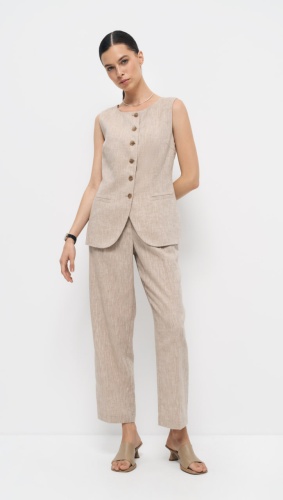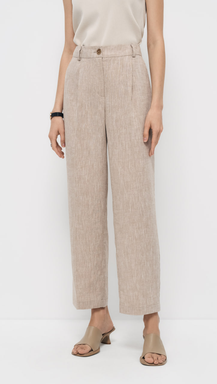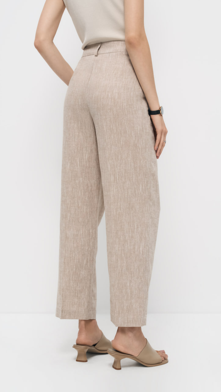 Укороченные брюки прямого силуэта выполнены из ткани с премиальным составом, в который входят лен и тенсел, создавая эффект меланжевых нитей. Итальянская фурнитура добавляет изделию качества и долговечности. Цвет «солёная карамель» придаёт брюкам тёплое и приятное ощущение.