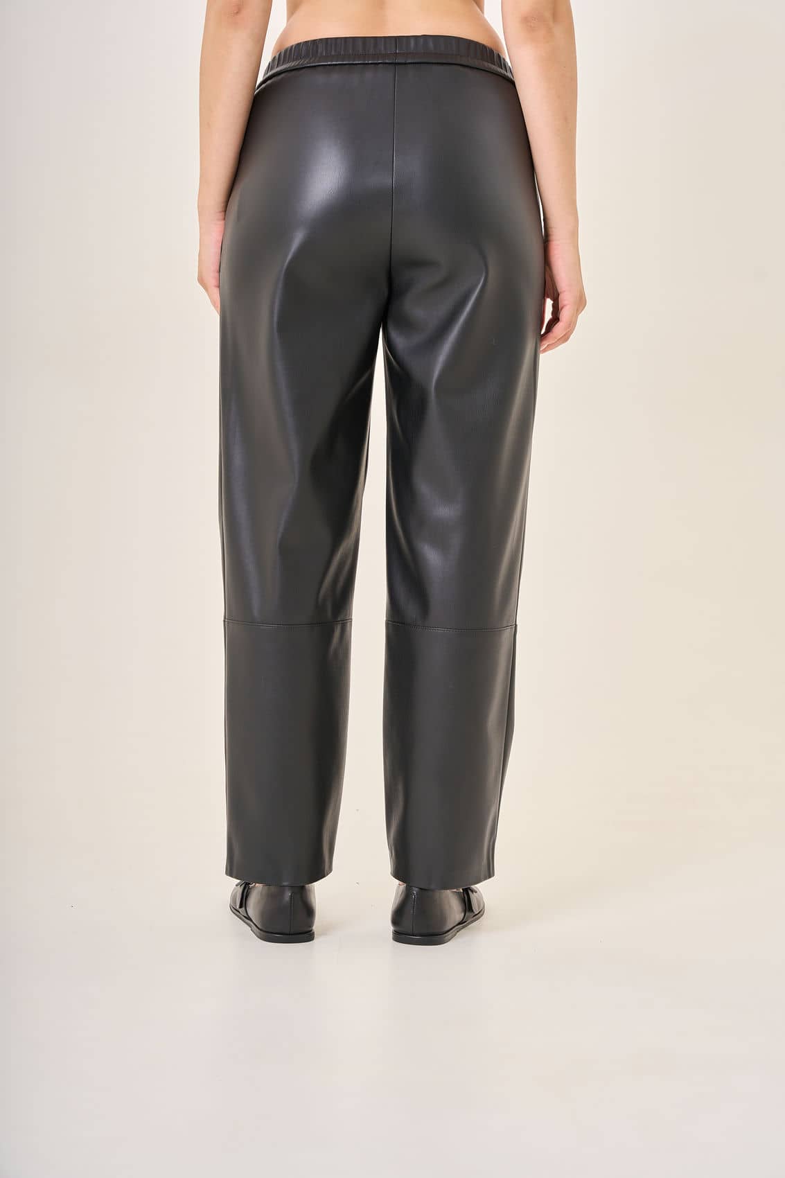 Черные штаны из эко-кожи на средней посадке. Эластичный пояс обеспечивает максимальный комфорт. Центральная строчка спереди создает элегантный акцент на коленях, подчеркивая стройность ног. Тщательно продуманная конструкция идеально садится на любую фигуру, подчеркивает достоинства и придает уверенности. Материал приятен к телу и сохраняет форму даже после многократных стирок. Осень-Зима'25/26. Капсула "Вишневый сад"