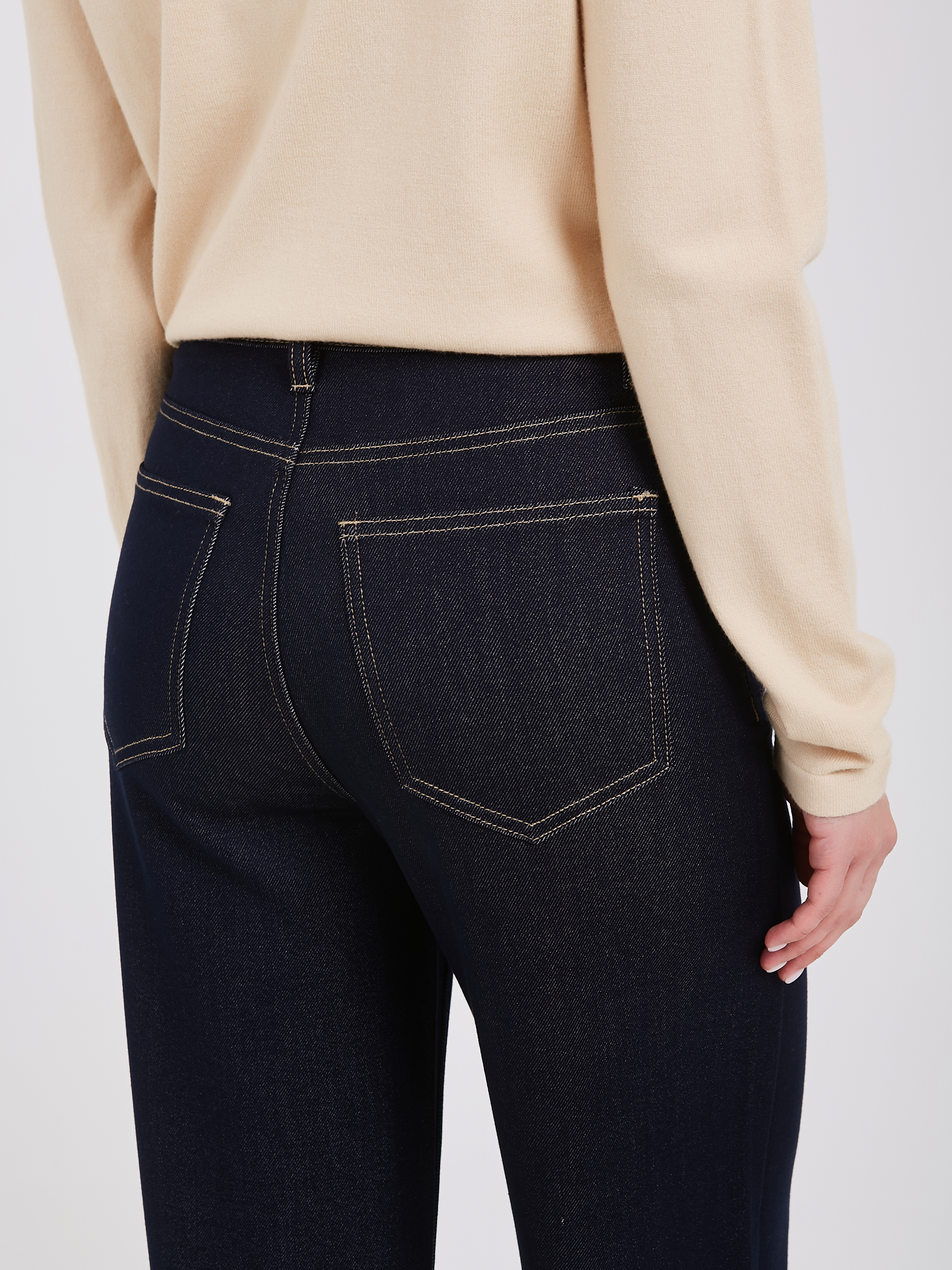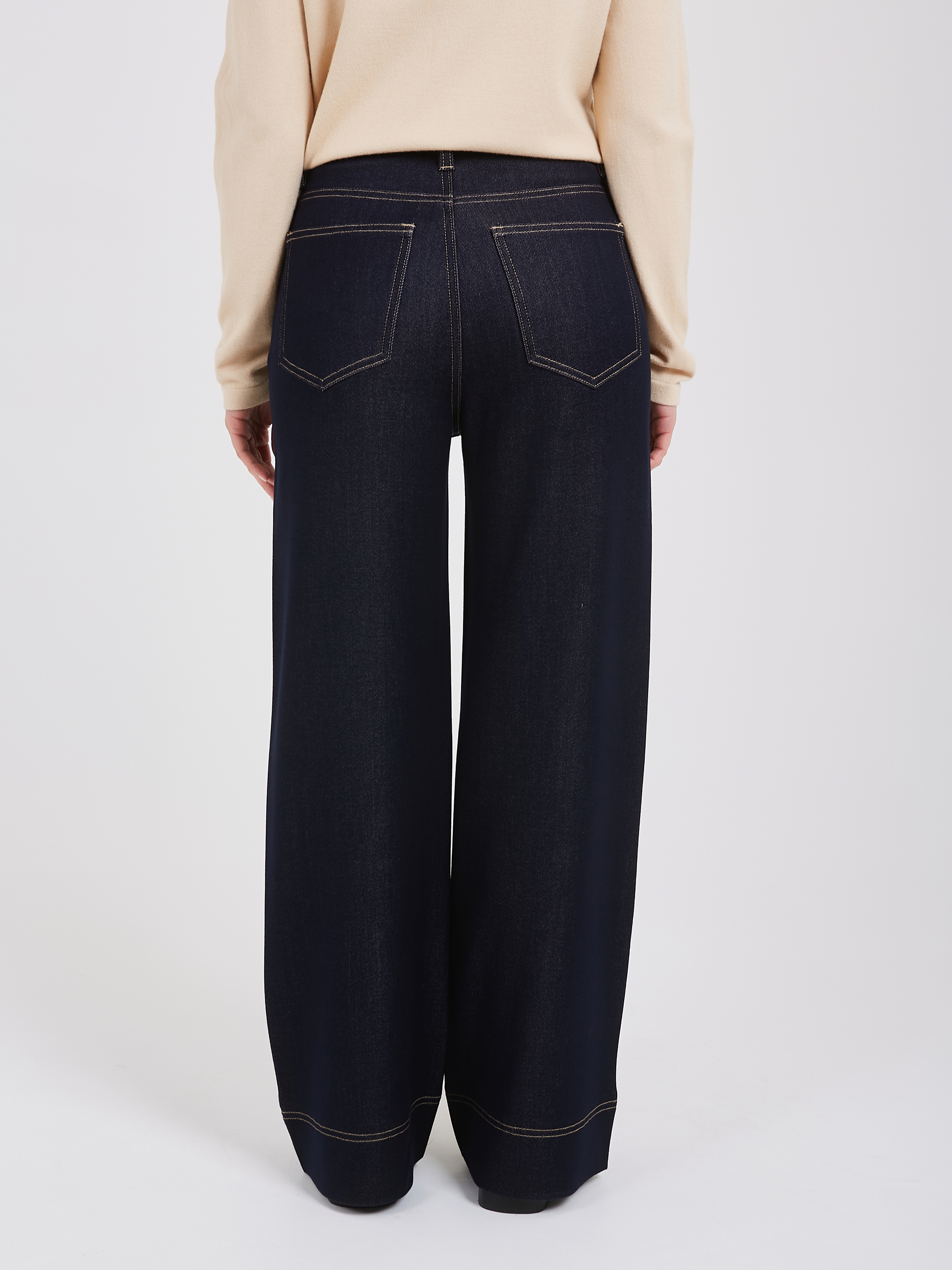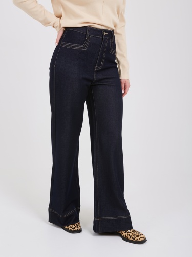 Джинсы синего цвета выполнены из плотной, но струящейся ткани. Яркая контрастная строчка за счет которой джинсы сочетаются с бесконечным множеством трикотажа. Средняя посадка, полная длина и заметное расширение от бедра книзу создают комфортный и свободный силуэт, идеально сидящий на любой фигуре. Осень-Зима'25/26. Капсула "Алые Паруса"
