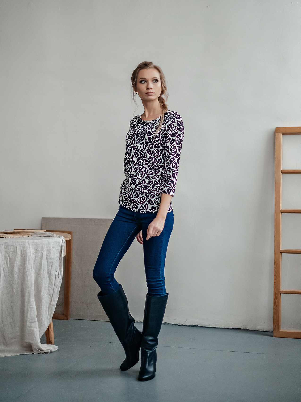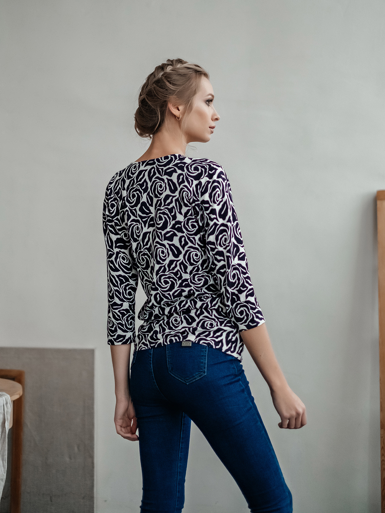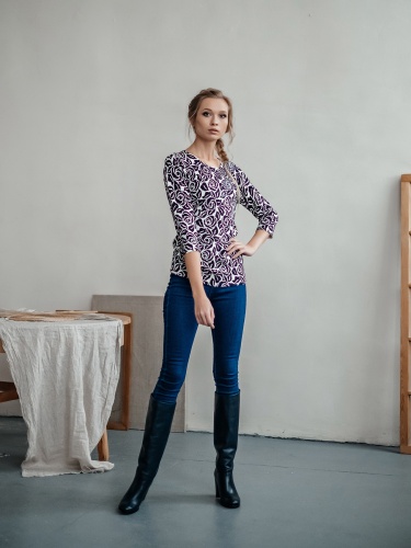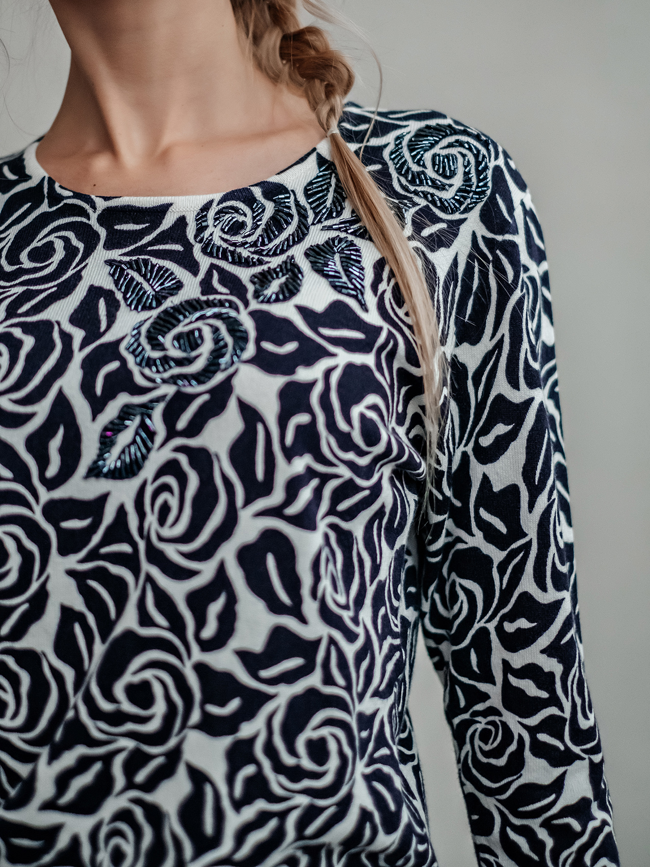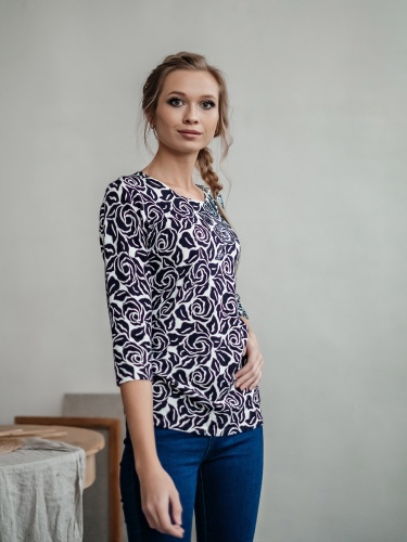 Классическое сочетание черного и белого может быть нежным и женственным! Это достигается за счет цветочного орнамента джемпера. Слегка приталенный силуэт, круглый вырез горловины, втачные рукава 3/4. Декор бисером придает джемперу изысканность. Материал из смеси с вискозой и хлопком приятен к телу и обеспечивает комфорт.