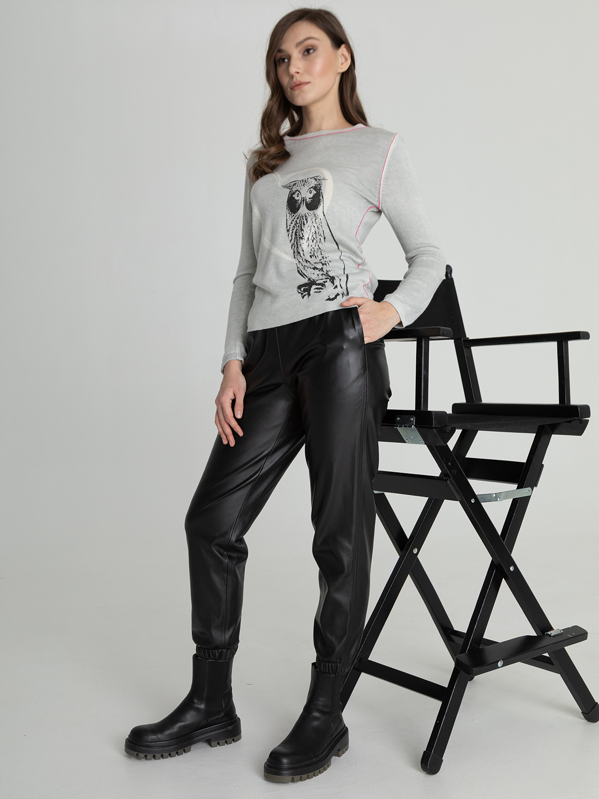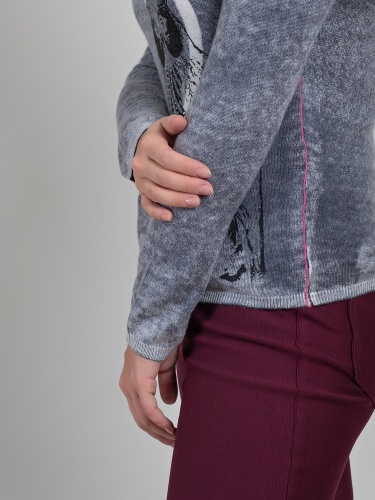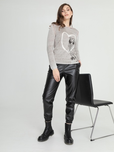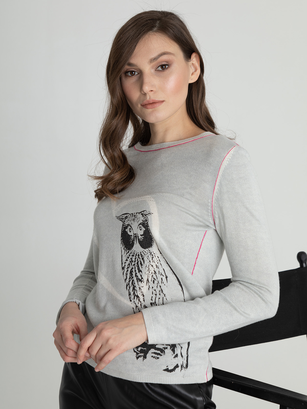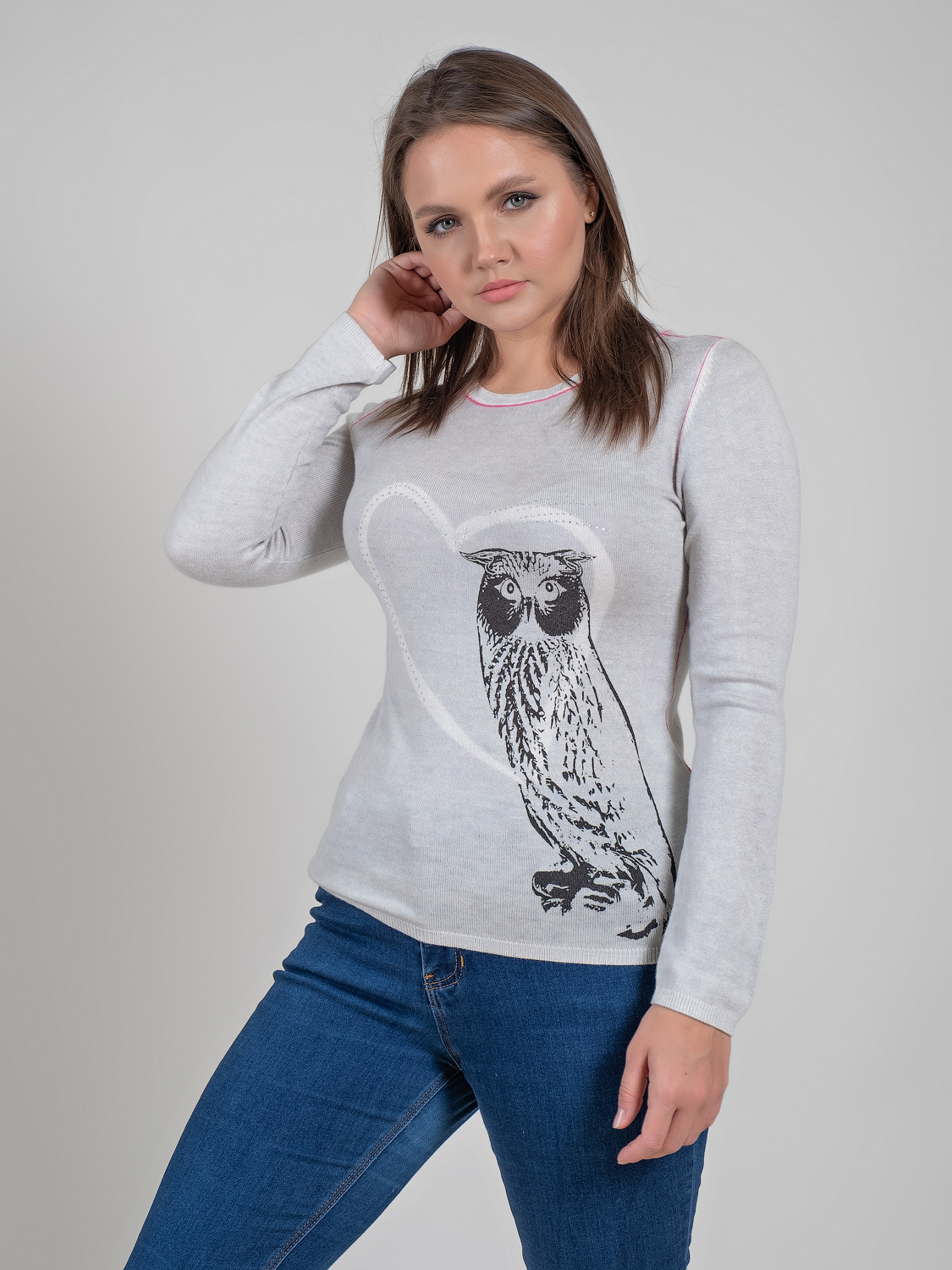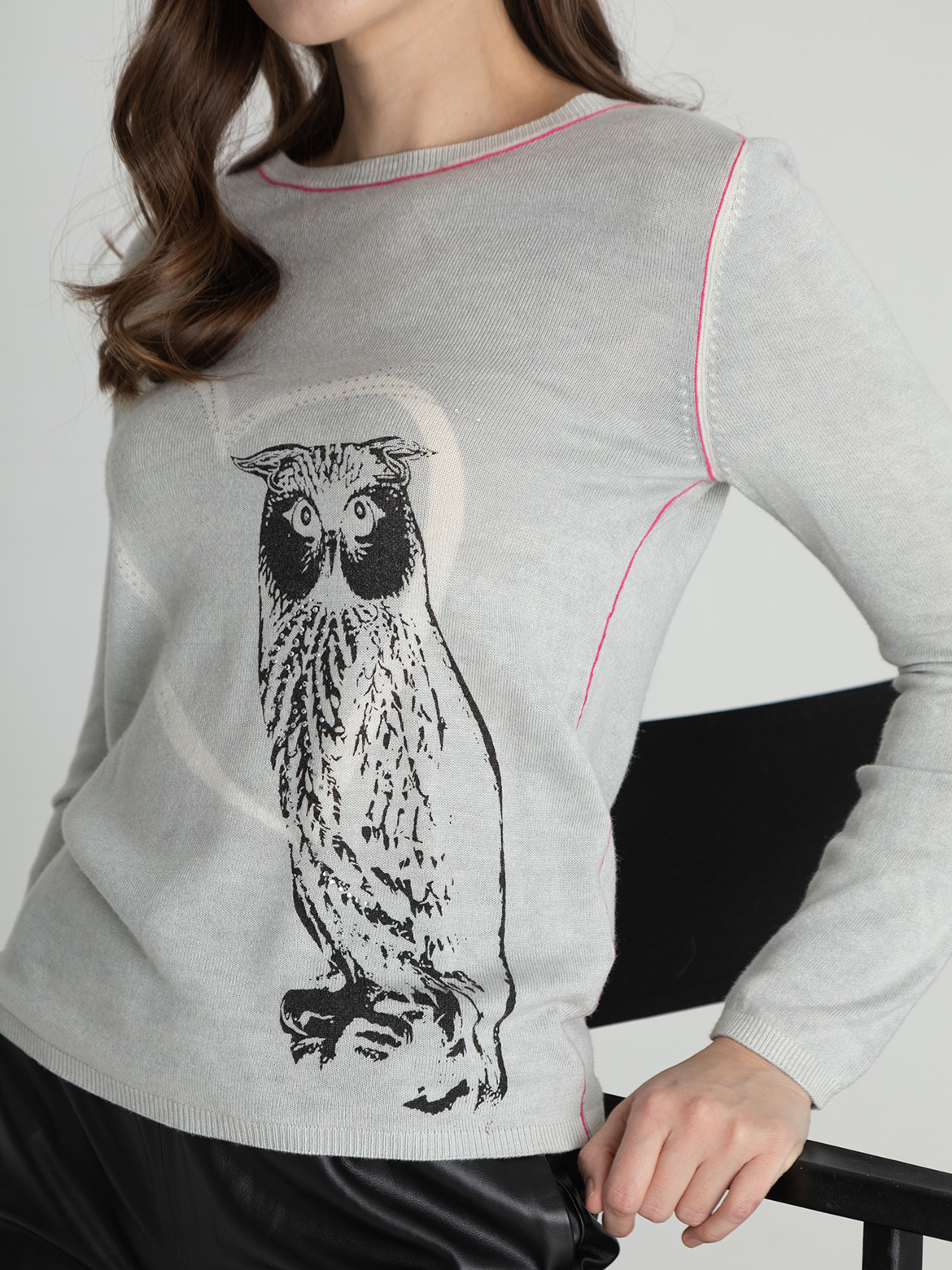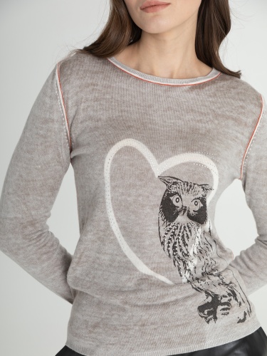 Мягкий джемпер с изображением совы и стразами может стать частью современного образа. Овальная горловина, вточной рукав полной длины.