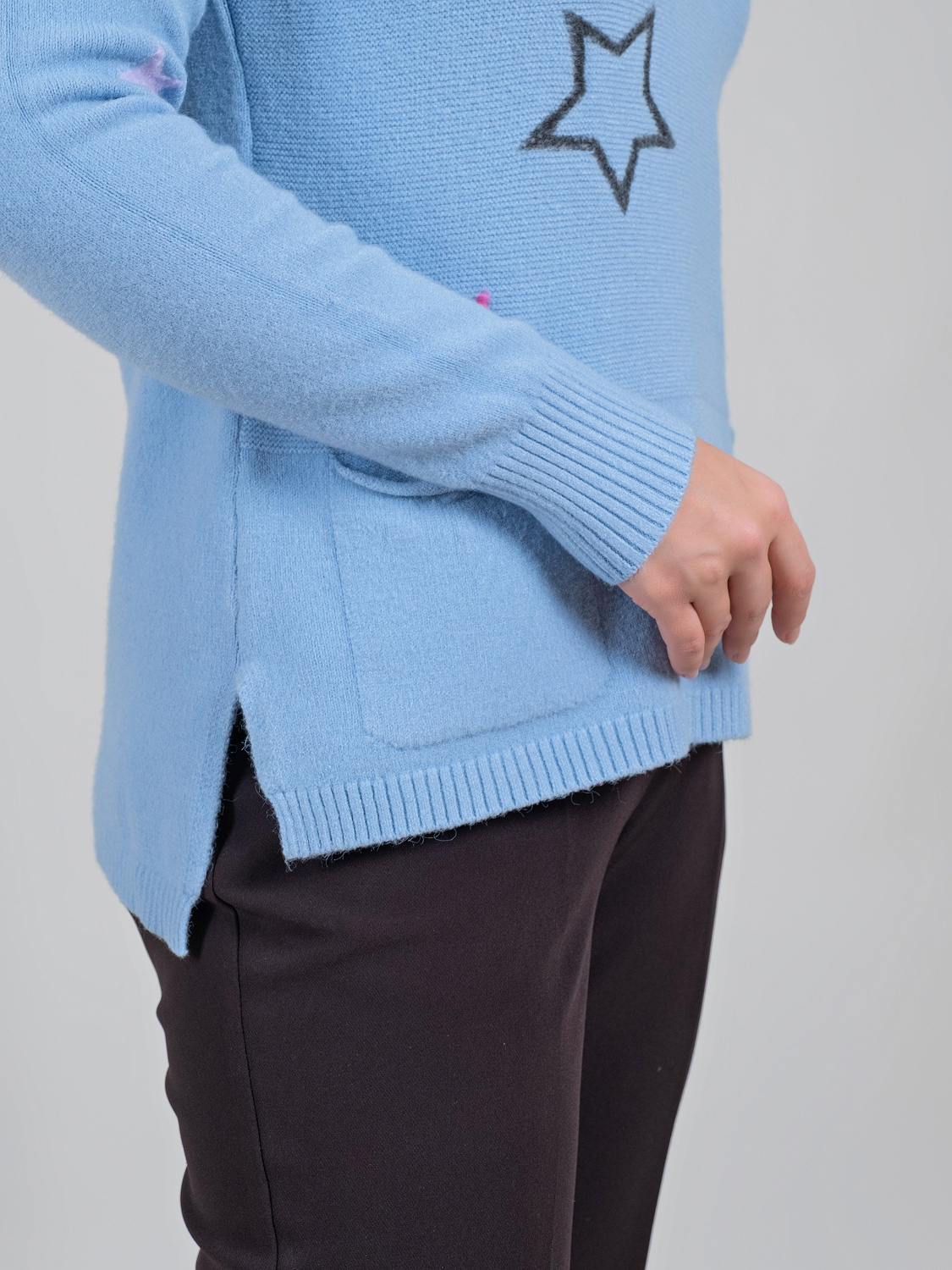В мягком джемпер будет тепло и уютно холодной зимой. Оригинальный звездный принт придаст неформальность образу.Овальная горловина, втачной рукав полной длины со спущенным плечом, удлиненная спинка. Спереди имеется два накладных кармана.