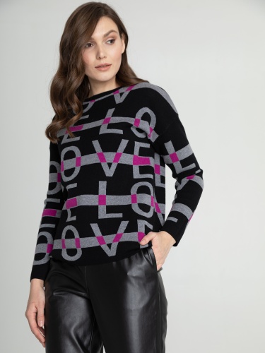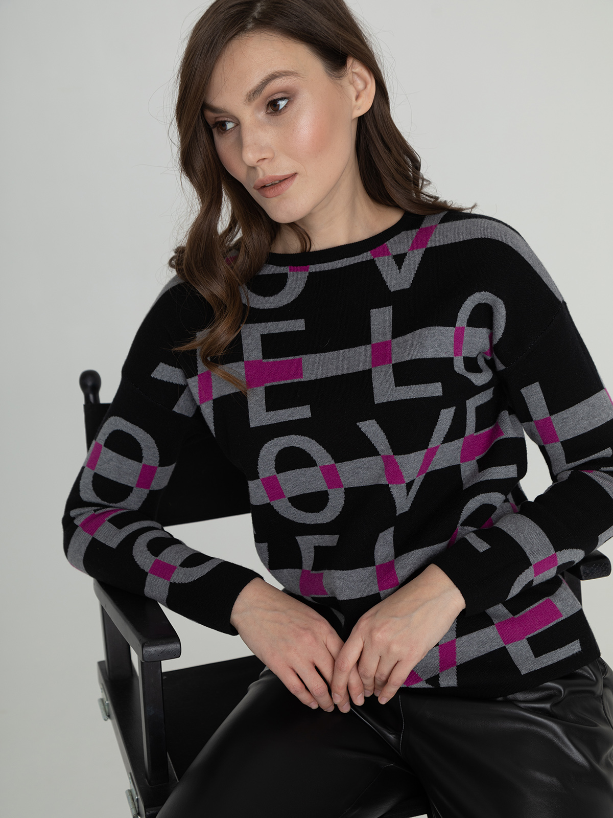 Оригинальный дизайн джемпера выполнен в контрастных цветах. Теплый материал идеально подойдет для холодной зимы. Джемпер прямого покроя с круглой горловиной и рукавом полной длины со спущеным плечом.