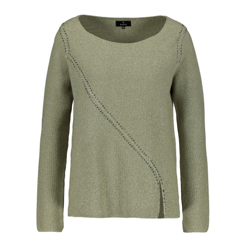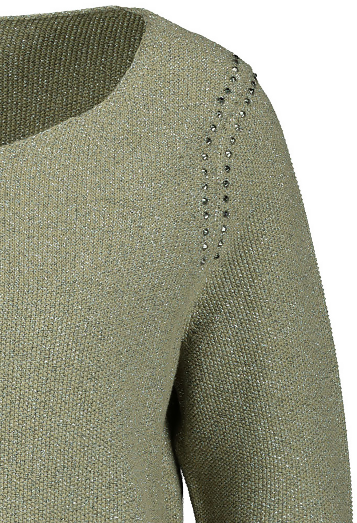 Джемпер прямого кроя трендового оливкового цвета. Широкая овальная горловина, втачной рукав полной длины. Перед и плечи украшают стразы. Небольшой разрез добавляет шарм изделию. Можно сочетать как с юбкой, так и с брюками.