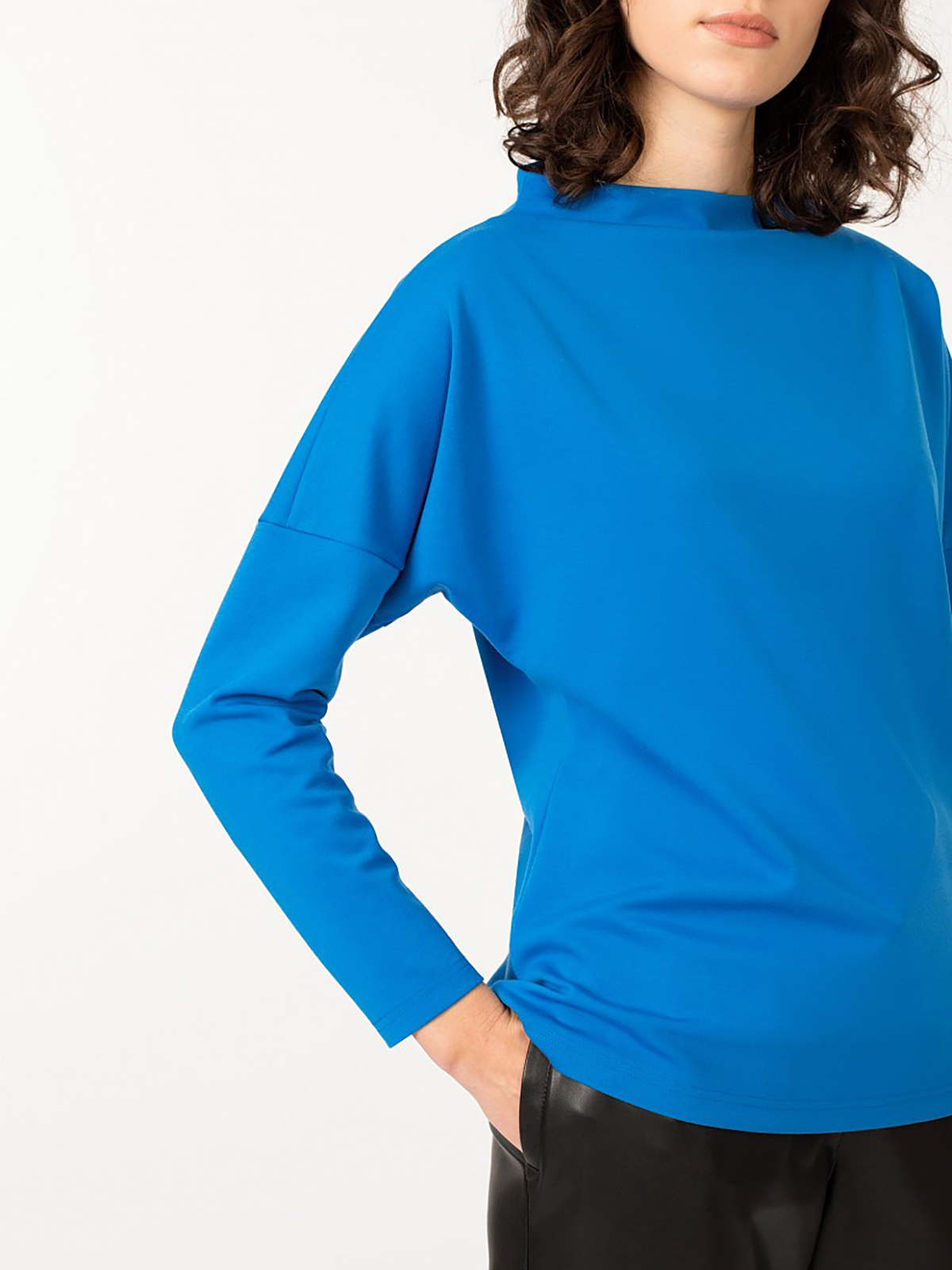 Насыщенный синий оттенок – бесспорный тренд сезона. Джемпер прямого кроя со спущенной линией плеч идеально впишется в образ в повседневном городском стиле. Вырез горловины лодочка. Материал приятен к телу и комфортен в ношении.