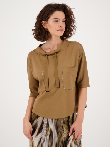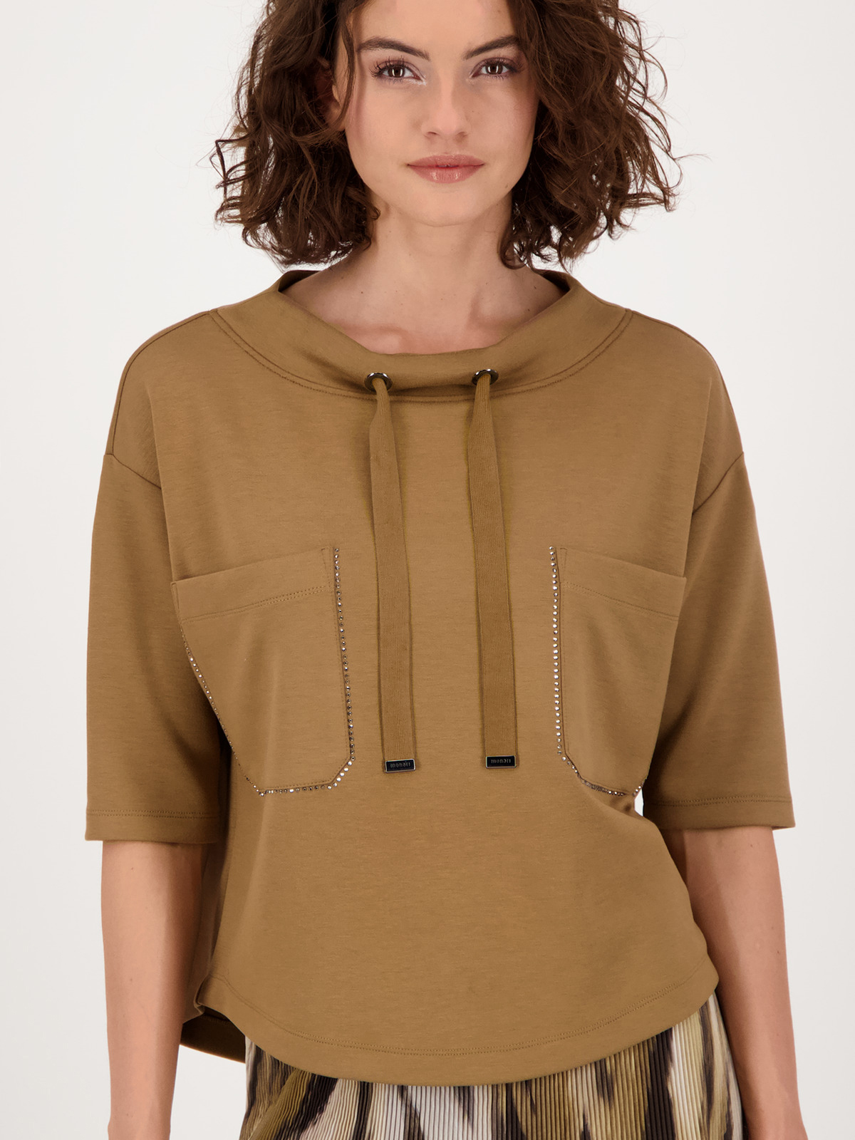 Однотонный пуловер свободного кроя с объемными накладными карманами на груди. Широкий воротник стойка с кулиской. Спущенная линия плеч, рукав до сгиба локтя.