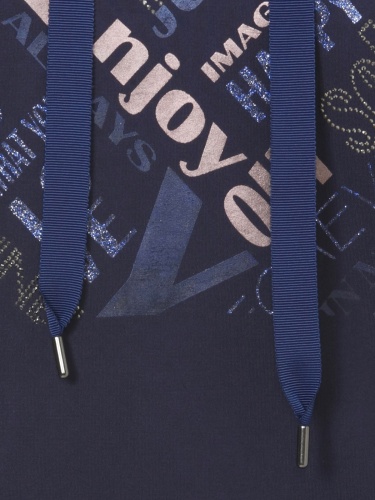 Однотонная толстовка насыщенного синего оттенка с оригинальным принтом на груди. Прямой силуэт, эластичная резинка по низу изделия. Капюшон на кулиске с широким шнурком в тон изделия. Спущенная линия плеч, длинные втачные рукава.
