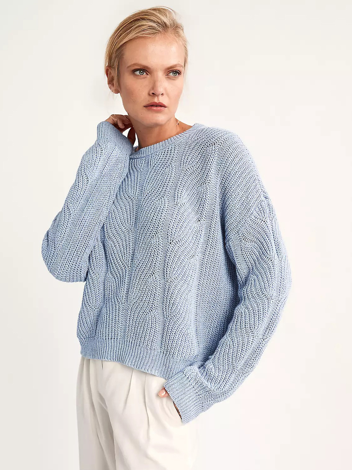 Однотонный джемпер крупной вязки. Материал из натурального хлопка. Свободный силуэт, спущенная линия плеч. Круглый вырез горловины, длинные втачные рукава.