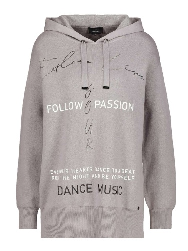 Однотонная толстовка прямого кроя в сером оттенке с принтом. Капюшон с кулиской и шнурком в тон изделия. Спущенная линия плеч, длинные втачные рукава с трикотажными эластичными манжетами. Широкая резинка в рубчик по низу изделия.
