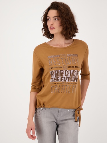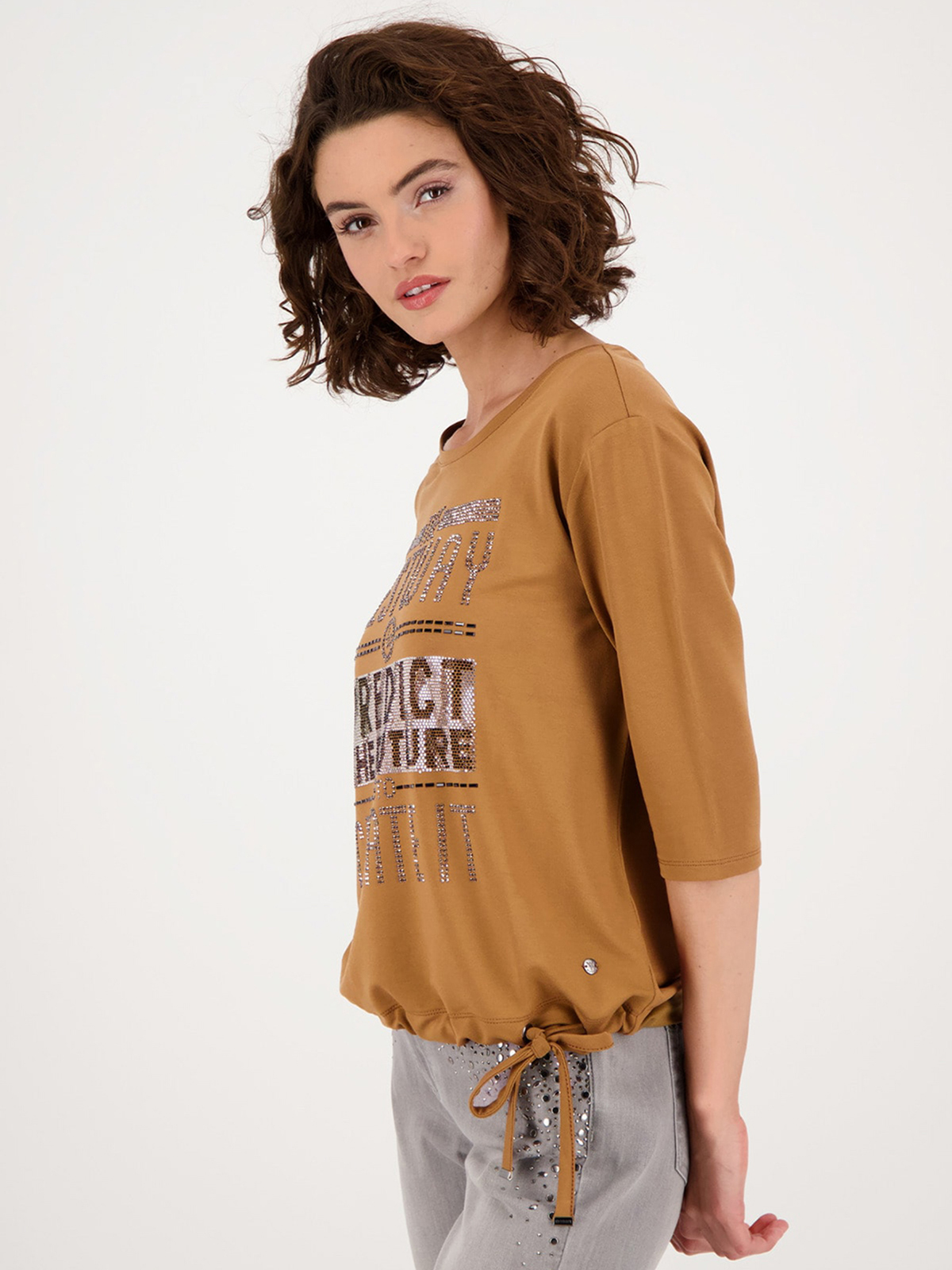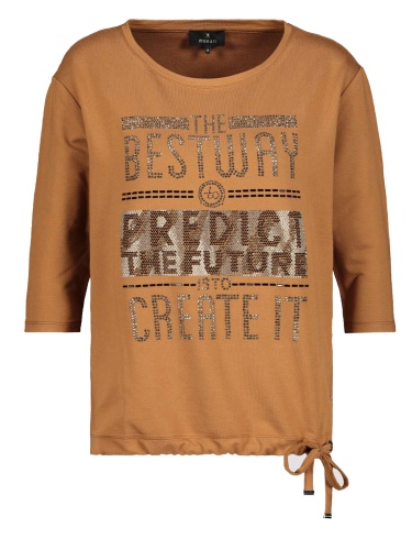 Фуфайка прямого кроя с принтом спереди. Втачной рукав ¾, вырез горловины – лодочка. Кулиска по низу изделия. Фуфайка может выступать как самостоятельный верх или надеваться под жакет или кардиган.