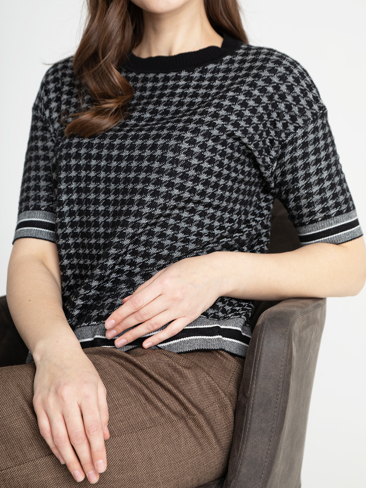 Джемпер прямого кроя с узором гусиная лапка по всей поверхности изделия. Короткий втачной рукав, спущенная линия плеч. Круглый вырез горловины, обрамлен черной бейкой в рубчик.