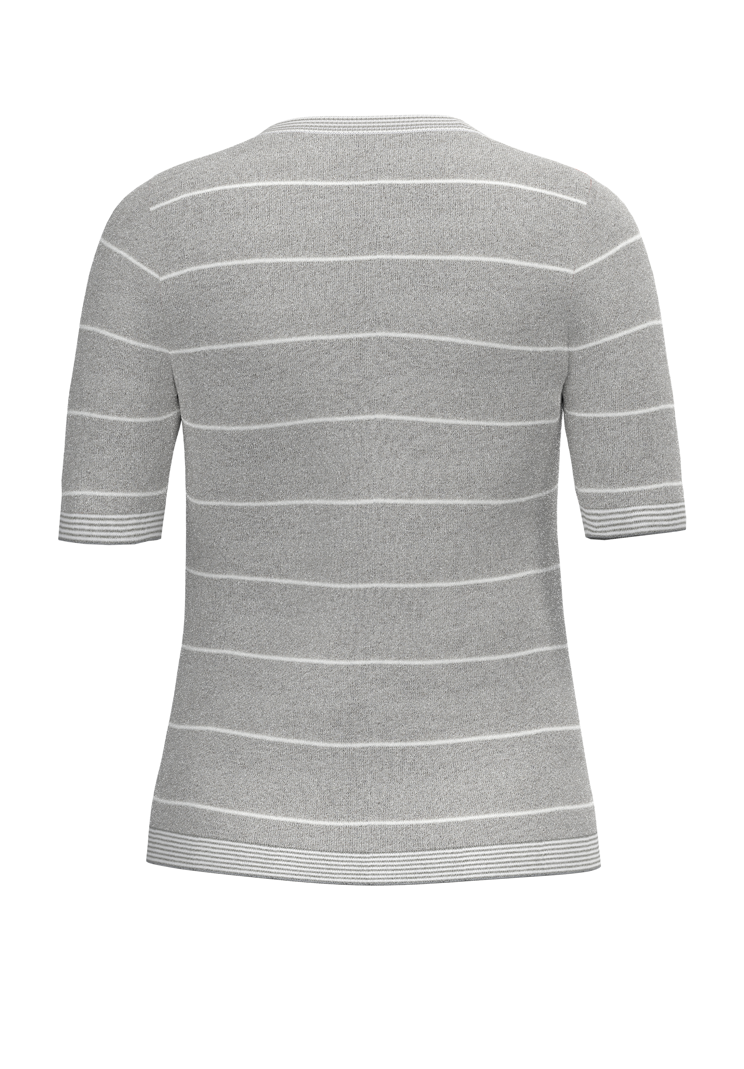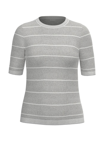 Серый трикотажный джемпер в узкую белую полоску. Втачной короткий рукав, круглый вырез горловины.
