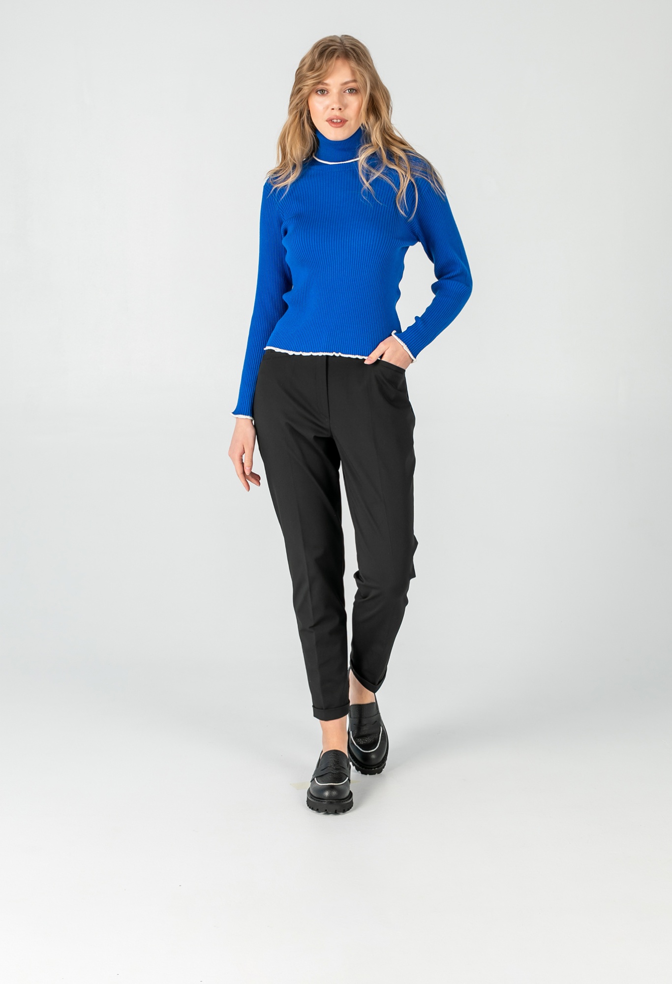 На сайте указаны российские размеры. Ткань: 50% хлопок, 50% акрил. Крой: однотонный джемпер-водолазка с высоким горлом в мелкий рубчик. Приталенный силуэт подчеркивает красоту фигуры, но благодаря достаточной плотности материала ее возможные недостатки не выглядят так явно. Прикрывает зону живота, не поднимается вверх при движении. Джемпер представлен в двух стильных оттенках – кирпичном и синем электрик. Отделка: ворот и рукава отделаны белой волнистой канвой, которая смотрится свежо и контрастно. Идеальный партнер для синих джинсов или темных брюк из коллекции Stern.