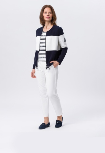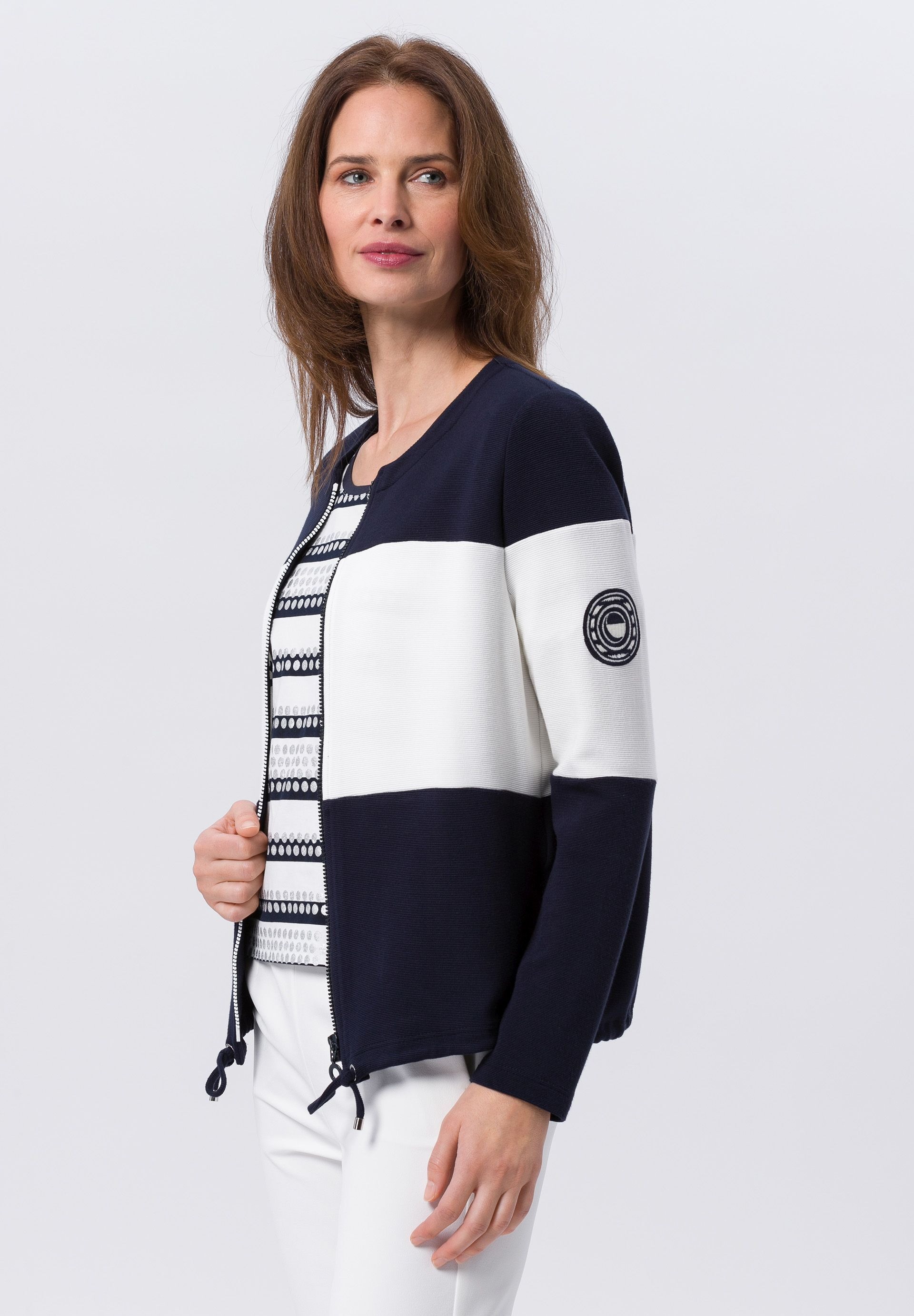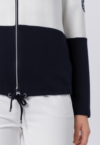 Двухцветный жакет из высококачественного структурированного трикотажа выглядит красиво и стильно. Удобная повседневная форма с круглым вырезом горловины, туннельной лентой и современной односторонней молнией.