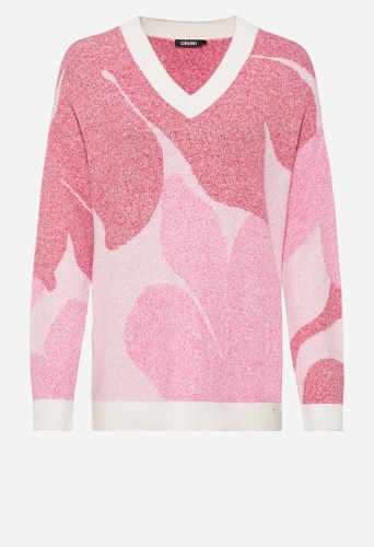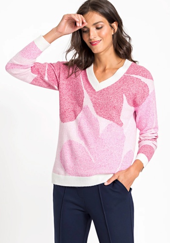 На сайте представлены российские размеры. Мягкий разноцветный свитер с v-образным вырезом сразу привлекает всеобщее внимание. С ребристыми деталями по краю и свободным, но подчеркивающим фигуру силуэтом.