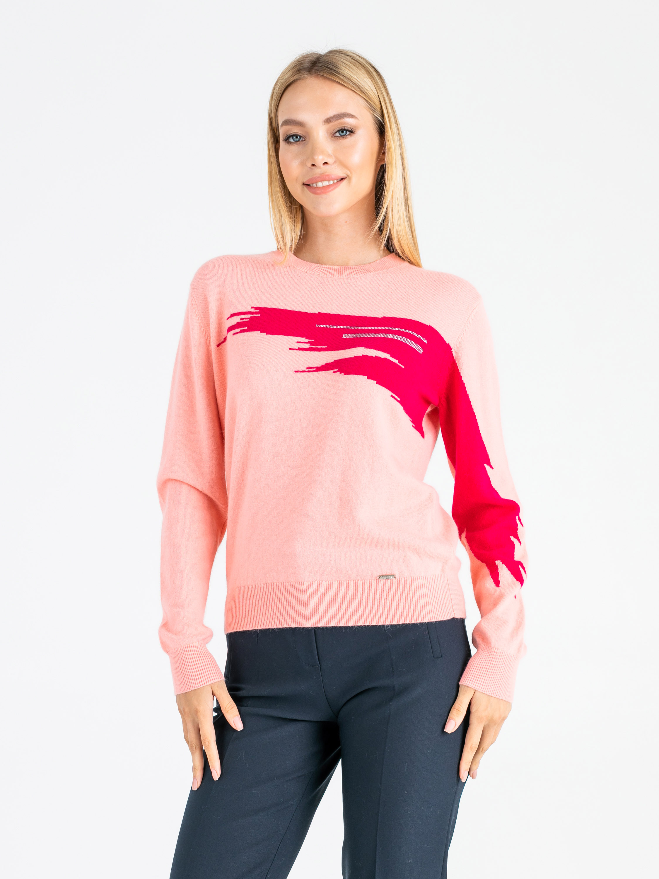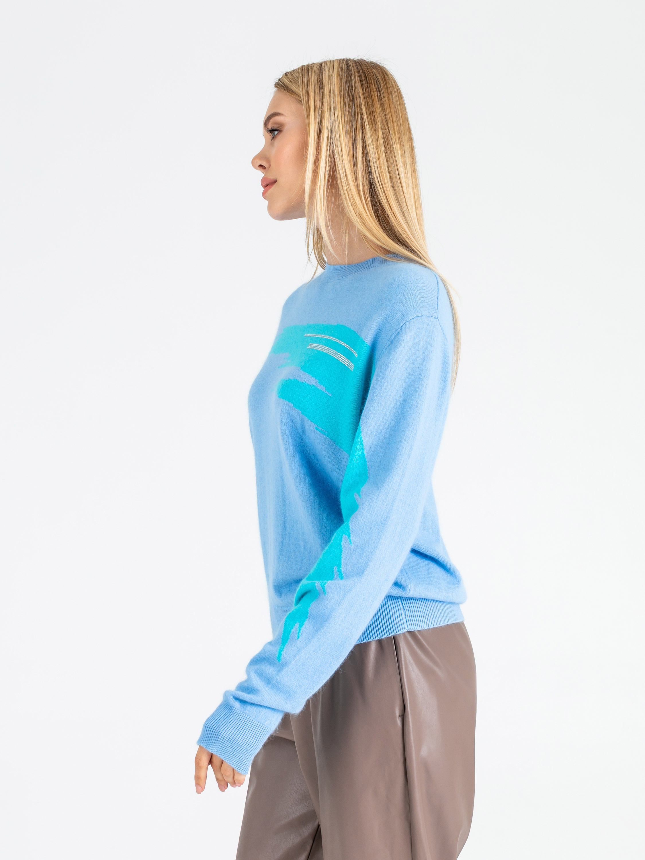 На сайте указаны российские размеры. Ткань: смесовая ткань средней плотности. В составе: 27% вискоза, 27% нейлон, 23% ангора, 23% шерсть. Крой: джемпер слегка приталенного силуэта с круглым вырезом и длинным рукавом. Комфортный материал, где за мягкость отвечает вискоза, а за тепло – ангора и шерсть. Резинки на манжетах и конце изделия обеспечивают надежное прилегание, Резинки на манжетах и конце изделия обеспечивают надежное прилегание, не открывают зону живота, что особенно актуально в холодное время года. Представлен в двух стильных оттенках – голубом и розовом. Отделка: художественная абстракция может восприниматься по-разному: для одних это мазок кисти художника, для других – хвост кометы. Небольшая дорожка страз добавляет звёздного сияния, делая вас – главной звездой этого дня. Джемпер украшен фирменным шильдиком. С коллекцией брюк и юбок для создания образа с джемпером можно познакомиться в соответствующих разделах нашего сайта. Рост модели - 177 см