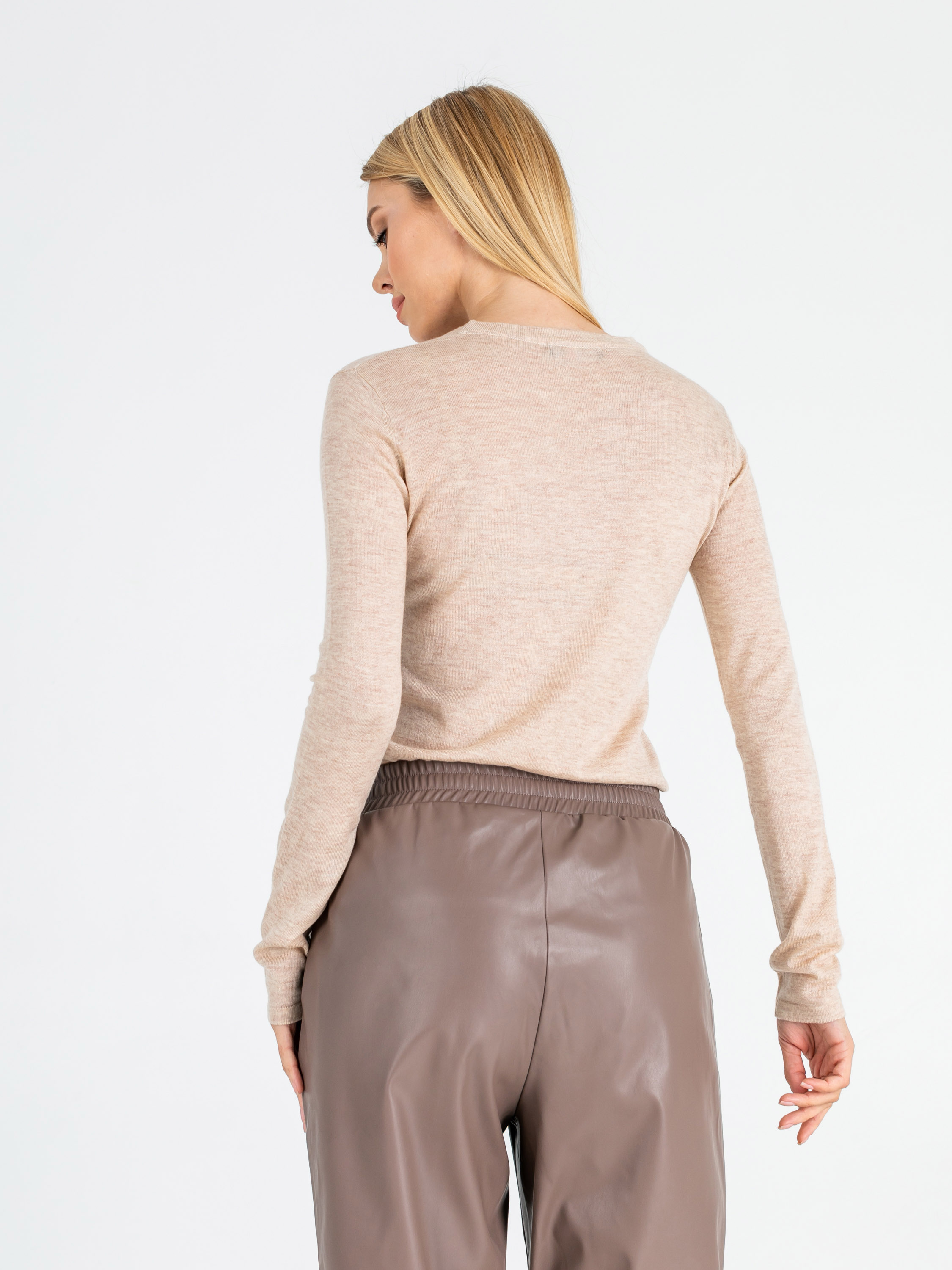 На сайте указан российские размеры. Ткань: 54% полиэстер, 20% акрил, 20% нейлон, 6% шерсть. Крой: гладкий трикотажный джемпер приталенного силуэта. Модель с круглым вырезом – идеальный вариант для повседневной носки, занятий спортом или создания рабочего образа. Тонкий, легкий и при этом очень теплый джемпер подчеркивает все достоинства фигуры. Представлен в трех актуальных оттенках – насыщенном синем, ярком красном и спокойном бежевом. Отделка: украшен фирменным металлическим шильдиком. С коллекцией брюк и юбок для создания полноценного образа можно познакомиться в соответствующих разделах нашего сайта. Рост модели - 177 см