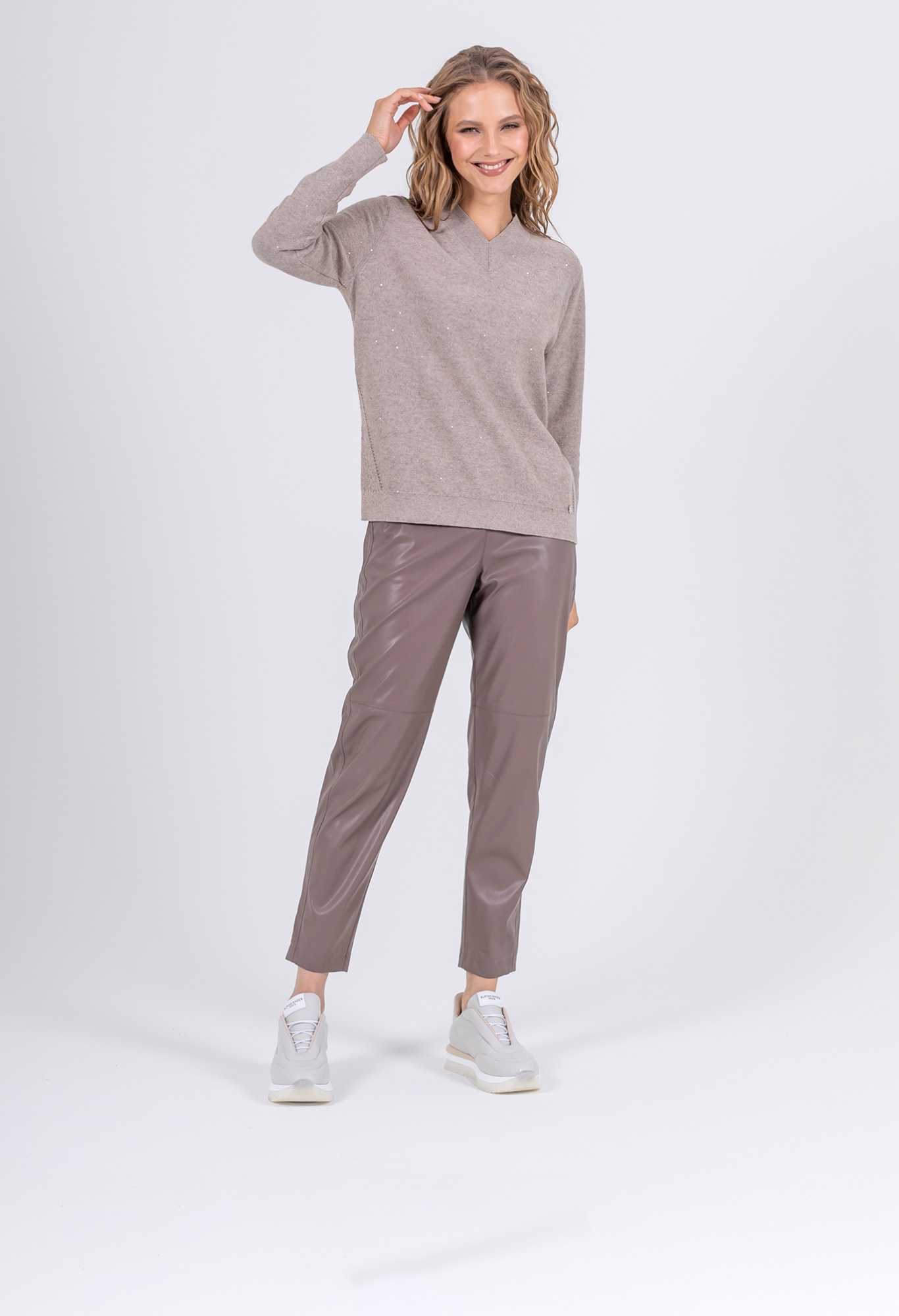 На сайте указаны российские размеры. Ткань: смесовая ткань средней плотности (5% кашемир, 10% шерсть, 30% вискоза, 55% нейлон). Отделка: базовый вязаный джемпер прямого силуэта с длинным рукавом. Классический V-образный вырез подчеркивает красоту шеи и вытягивает силуэт, а еще дает возможность дополнять и усложнять образ однотонной футболкой или рубашкой под низ. Имеет достойную длину, которая закрывает зону живота и скрывает возможные особенности фигуры. Отделка: благородный пастельный оттенок дополняется едва заметным блеском от плоских пайеток, деликатно рассыпанных по поверхности. Боковая часть джемпера украшена художественной перфорацией и узором отличной от основной ткани фактуры. Сочетайте с различными моделями кожаных брюк из ассортимента Stern.