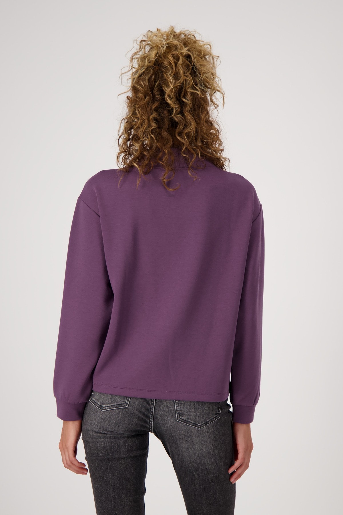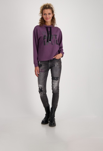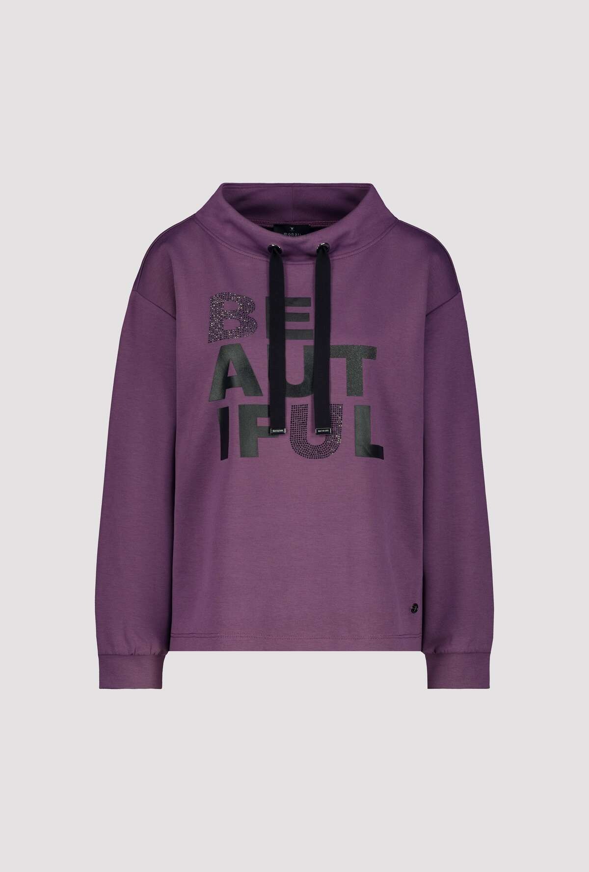 На сайте указаны российские размеры. Толстовка с длинными рукавами, воротником-стойкой и стразами. Удобная посадка обещается благодаря прямому крою с воротником-стойкой, широким манжетам на концах рукавов и слегка завышенным плечам. Надпись из глиттера, сверкающих стразов и блестящего лакового принта стала изюминкой довольно простой во всем остальном рубашки. Модель ростом 176 см