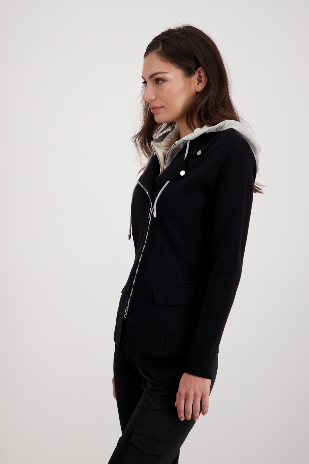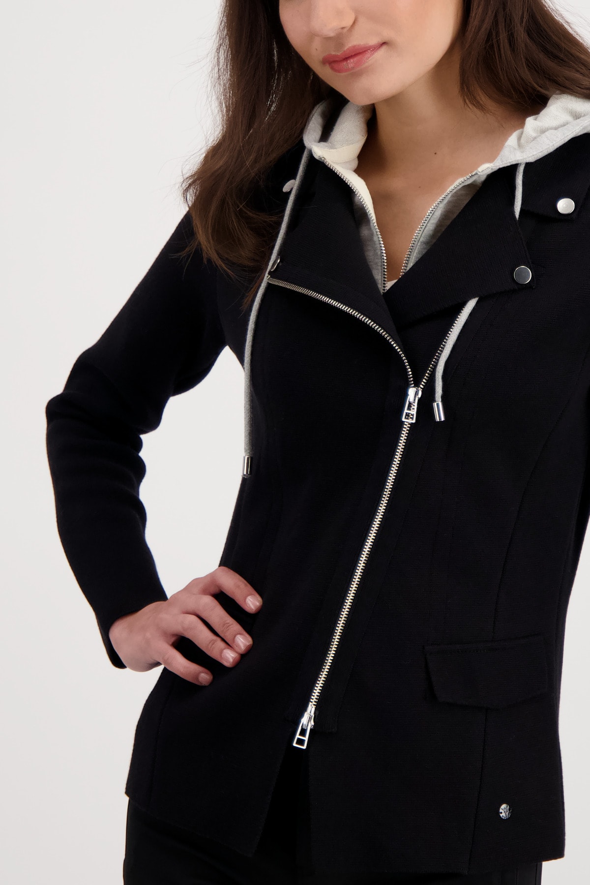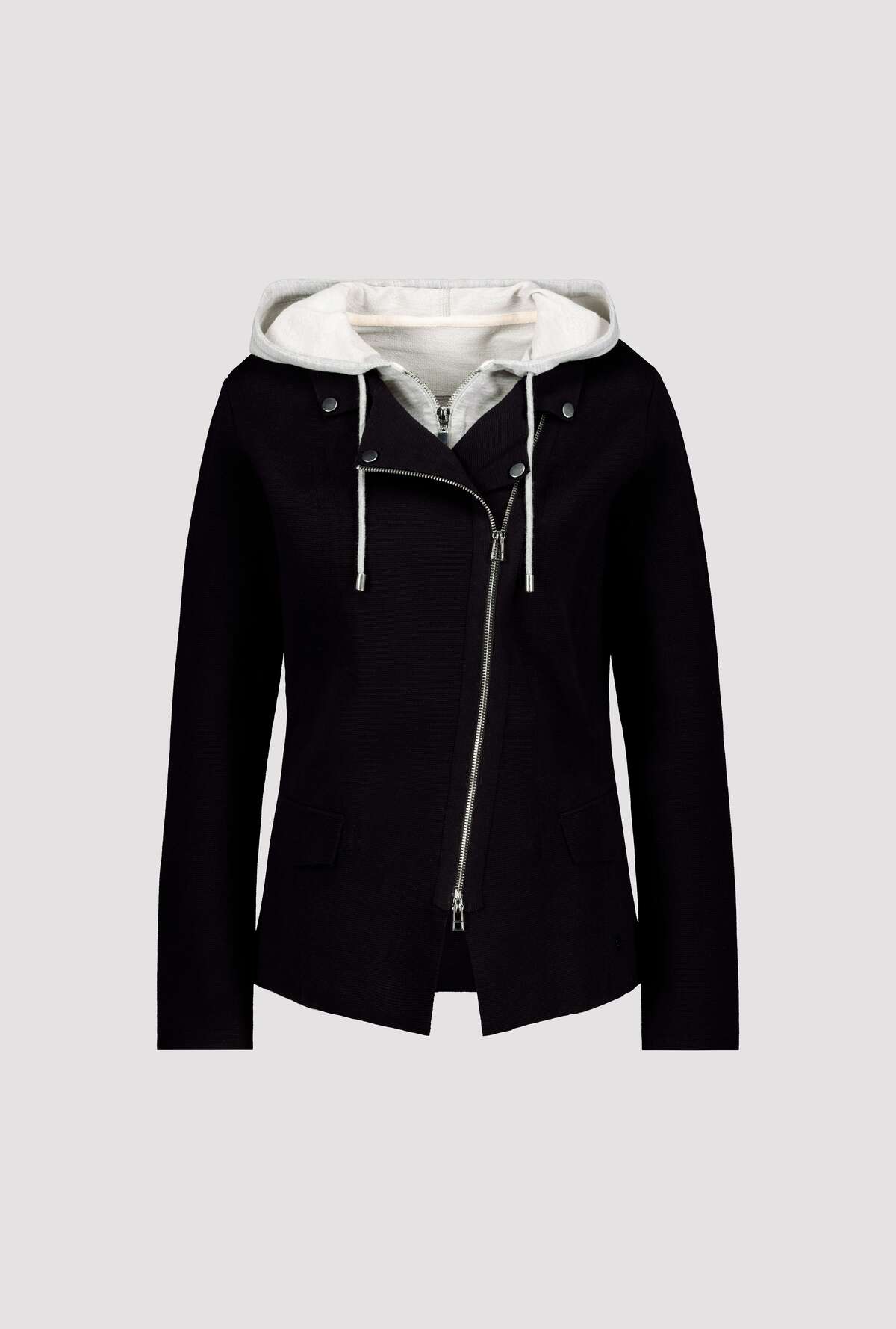 На сайте указаны российские размеры. Вязаный блейзер со съемной вставкой от пота. Классная вставка от пота с капюшоном и молниями уникальным образом украшает ваш образ и без проблем снимается. Аутентичный образ с ложными карманами с клапанами и слегка диагональной двусторонней молнией стильно и по-спортивному дополнен декоративными пуговицами на воротнике с лацканами. Рост модели 179 см.