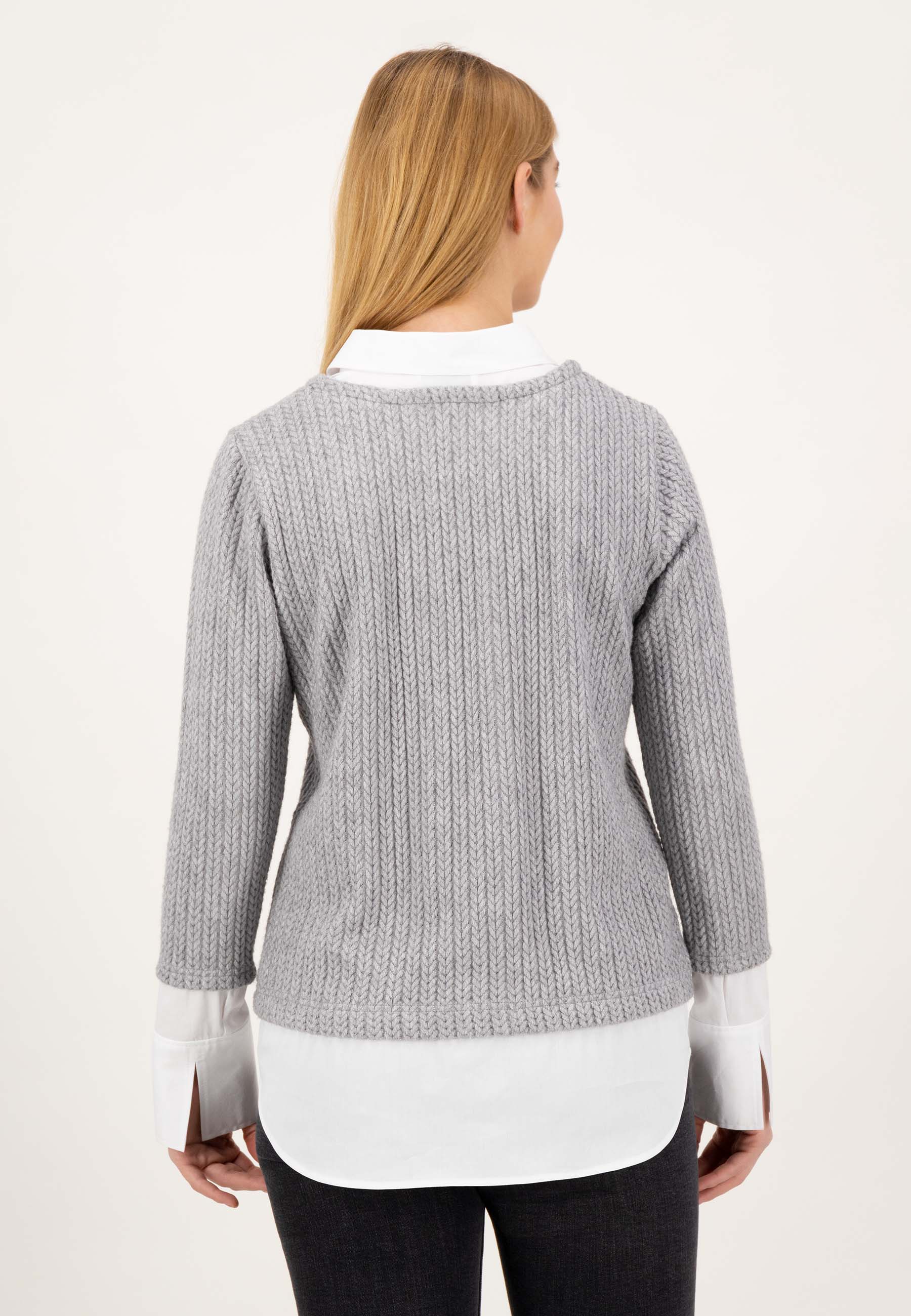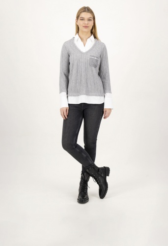 На сайте указаны российские размеры. Этот пуловер «два в одном» умело устраняет грань между повседневностью и шиком — благодаря блузочной вставке с рубашечным воротником в пуловере вы можете легко создать прекрасный образ. Благодаря удлиненной задней части свитер 2 в 1 создает красивый силуэт. Внешний вид грубой вязки привлекает внимание в сочетании с прикрепленным карманом из мерцающего контрастного материала. Блестящие детали прекрасно завершают детализированный стиль уникального свитера! Рост модели 177 см Измерения для 44 размера: Окружность груди: 104 см Талия: 101 см Ширина бедер: 110 см Длина спинки: 70 см Длина рукава: 62 см