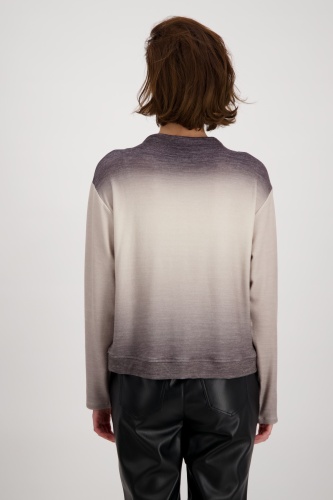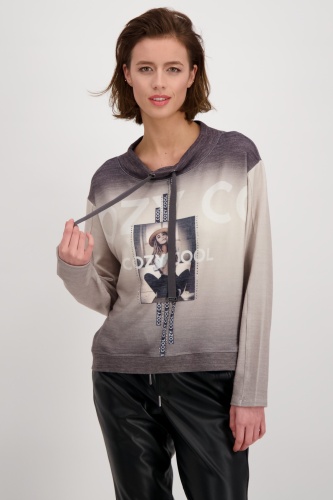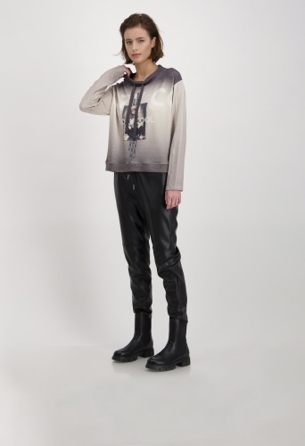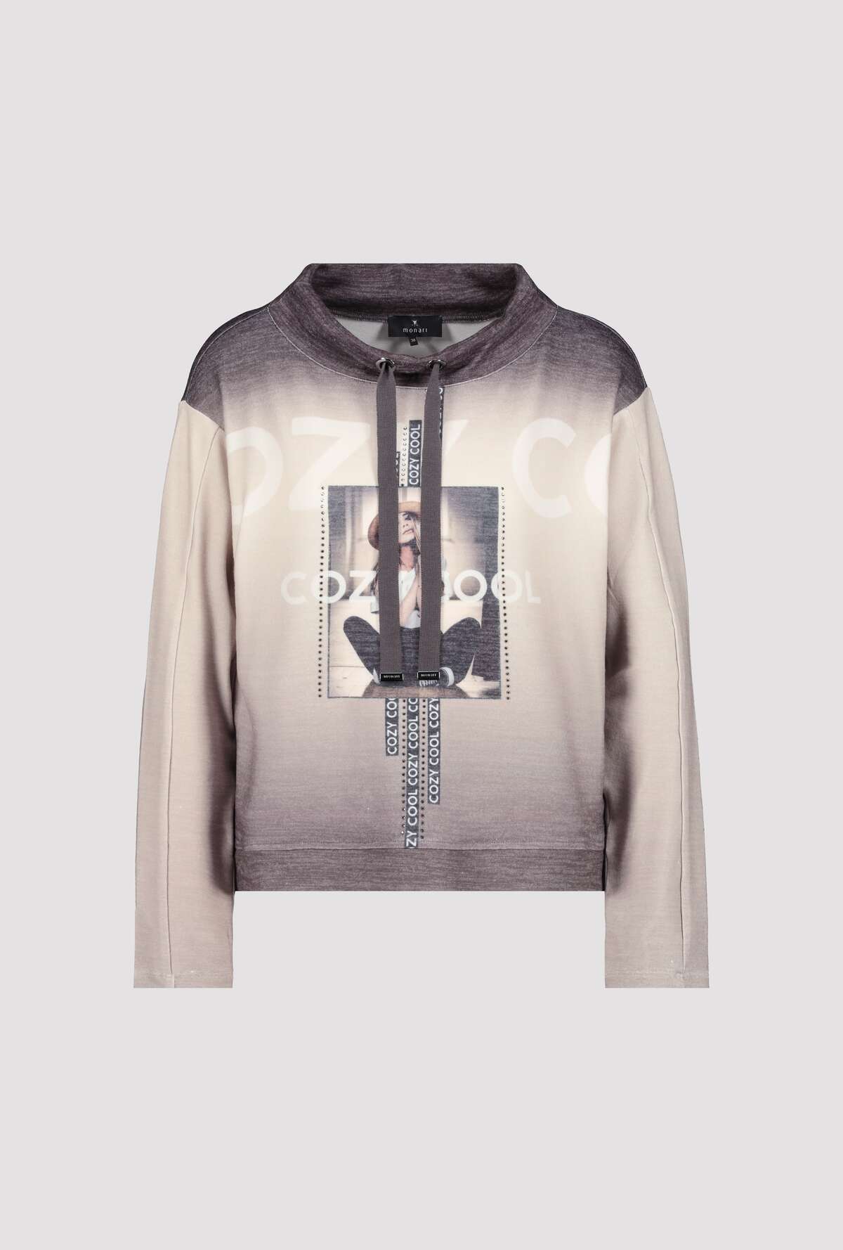 На сайте указаны российские размеры. Легкая толстовка с длинными рукавами, воротником-стойкой и принтом. Толстовка прямого кроя, воротник-стойка с люверсами и завязками, слегка приспущенная линия плеч и широкая манжета по низу. Красивый сплошной цветовой градиент прерывается фотопечатью с деталями в виде букв и сверкающими стразами спереди. Идеально сочетается с женственными кожаными брюками и крутыми черными ботинками. Модель ростом 178 см. Длина спины 44 размера 58 см.