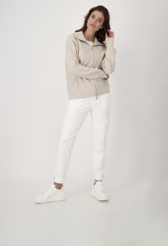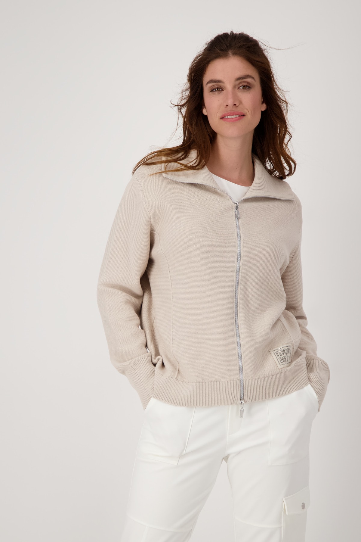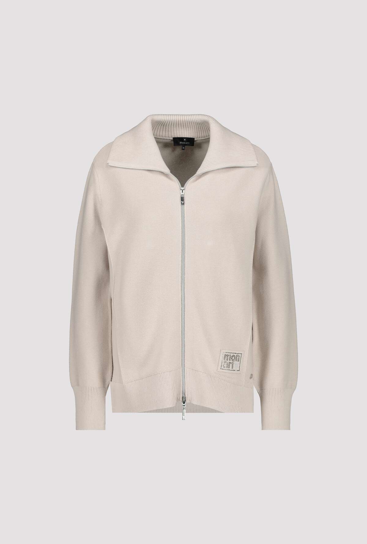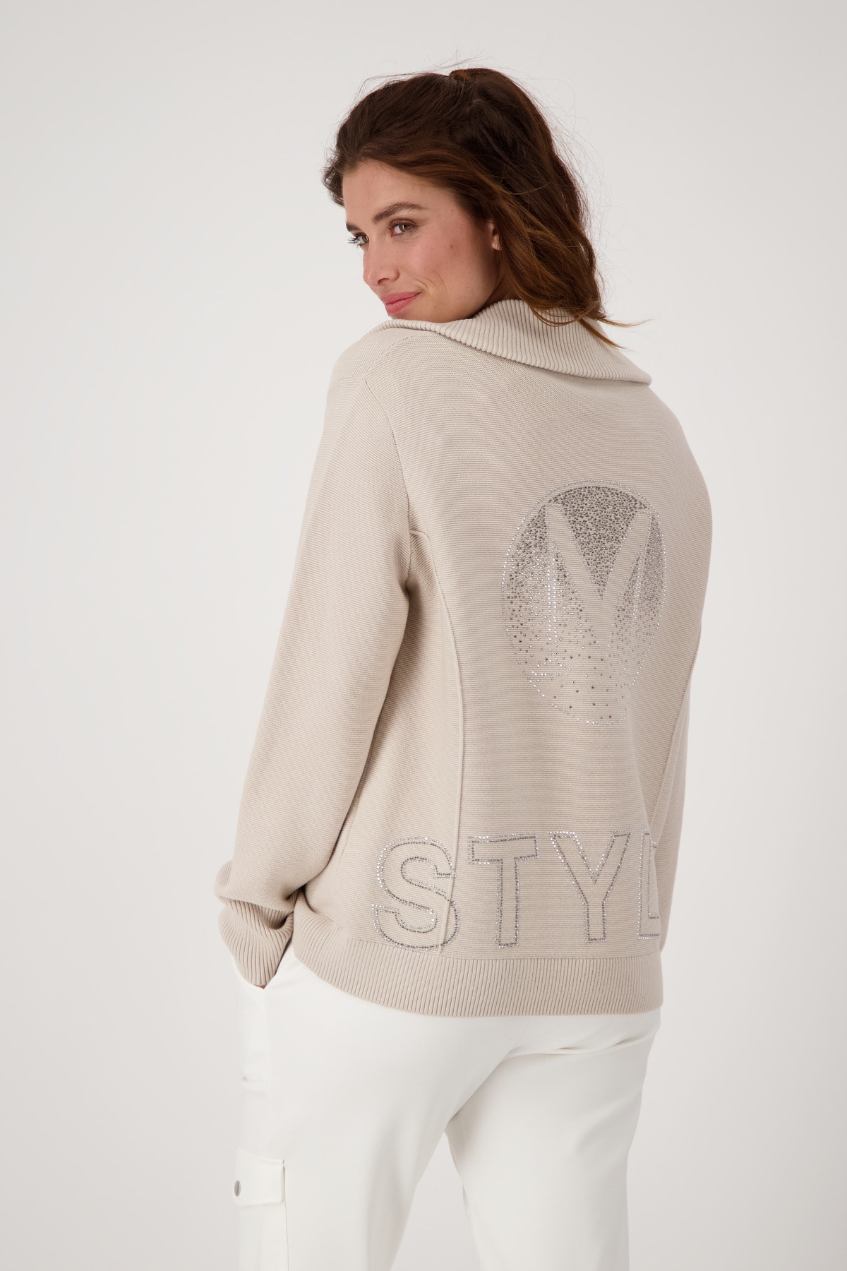 На сайте указаны российские размеры. Кардиган из хлопка с воротником-стойкой и аппликацией из страз. Воротник-тройер имеет молнию, спина украшена большой эмблемой из страз и надписью из страз. Рядом с двусторонней молнией находится тональная нашивка с блестящей надписью спереди. Структура левого вязания прерывается широкими манжетами из резинки на концах рукавов и по низу. Чистый хлопок обещает удобную посадку на весь день. Рост модели 175 см Длина по спинке 44 размера составляет 63 см, а по переду – 60 см.