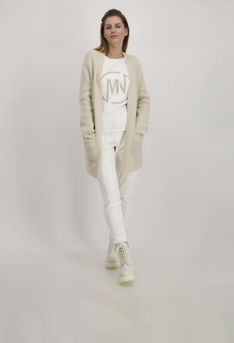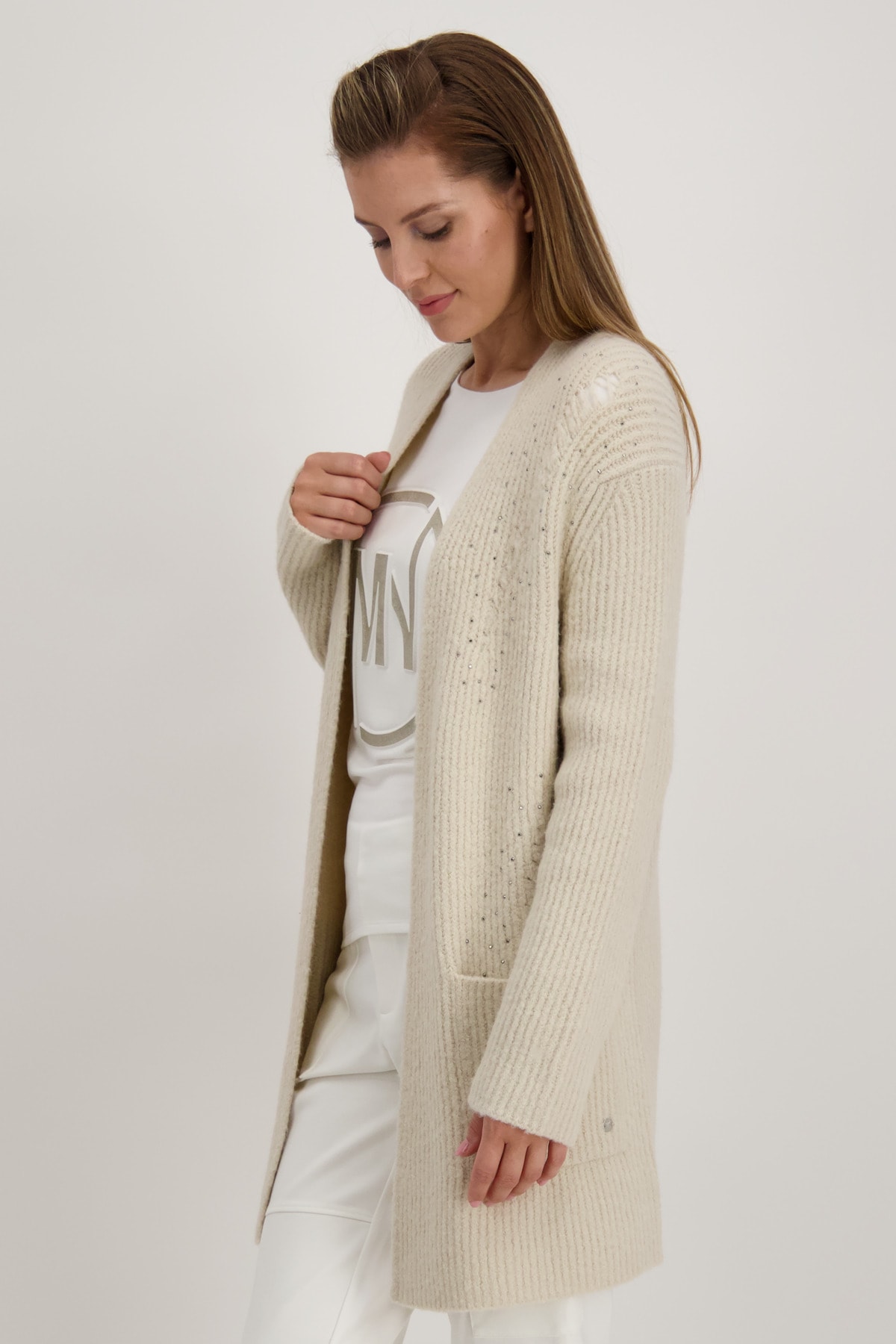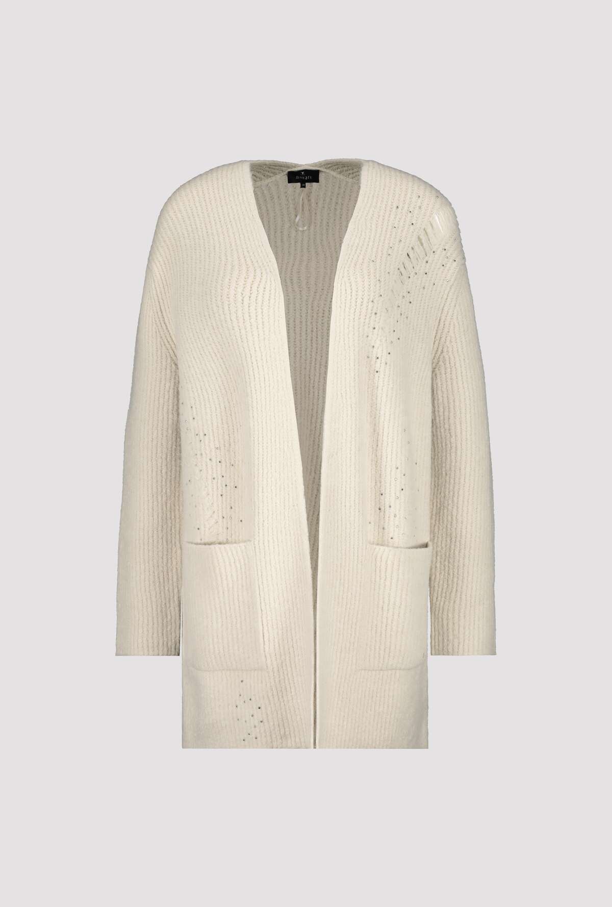 На сайте указаны российские размеры. Открытый кардиган оверсайз с карманами и стразами. Однотонный кардиган от monari искусно приправлен рваными секциями со сверкающими стразами спереди. Состав мягкого материала обеспечивает идеальное ощущение комфорта, а длинная прямая форма обеспечивает удобную посадку. Модель без застежки носится стильно в расстегнутом виде, поэтому полностью комбинируемая модель — это всегда выбор для многих случаев. Модель ростом 178 см. Длина спины 44 размера 78 см.
