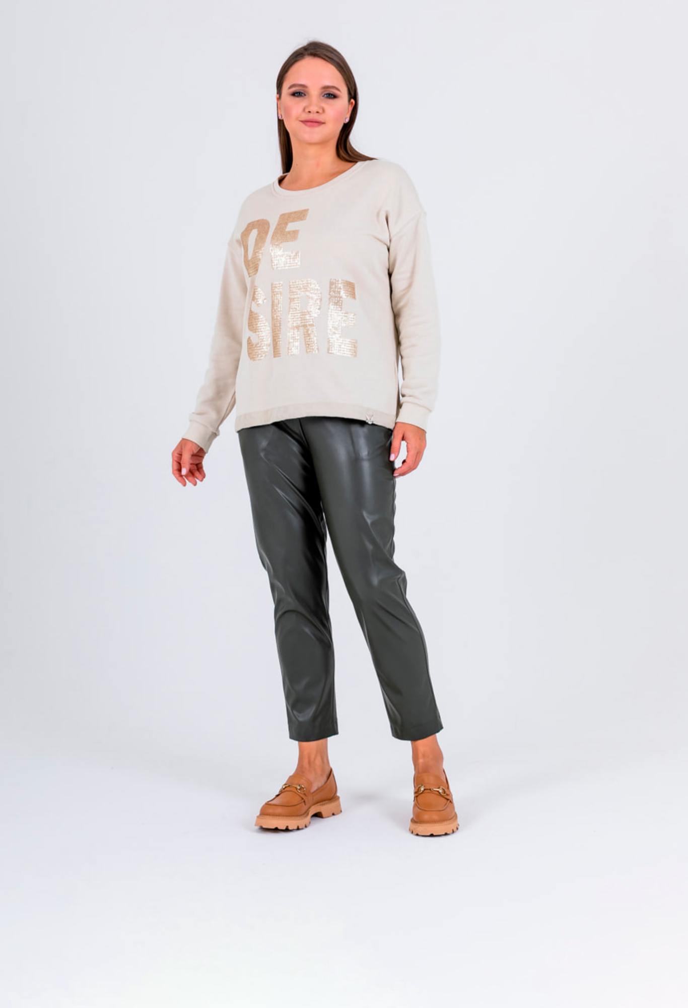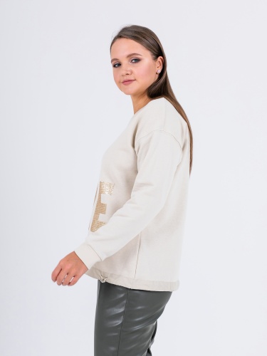 Свитшот прямого силуэта средней длины из легкого 100% хлопка. По переду выполнена эффектная вышивка пайетками. Низ обработан кулиской с резинкой и металлическим фиксатором, для регулировки объема. Длинные втачные рукава с манжетами. Круглый вырез горловины.