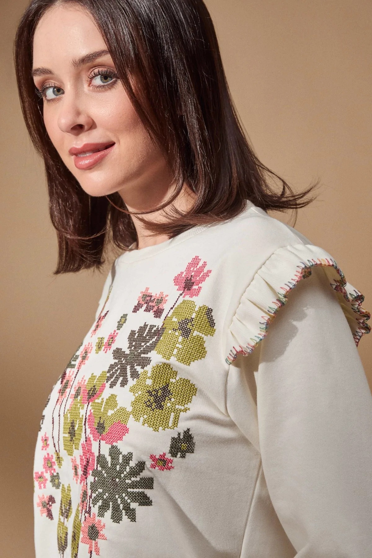 На сайте указаны российские размеры. Белая толстовка, вышитая цветами, с длинными рукавами. Также на рукавах, отделанных манжетами, имеется небольшой рюш на части чашки, отделанной разноцветной вышивкой. Рост нашей модели 170 см. Длина 59 см для размера 44.