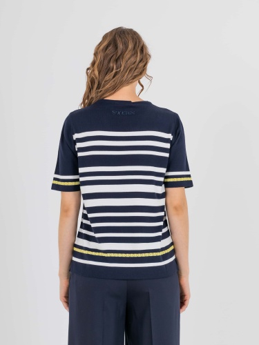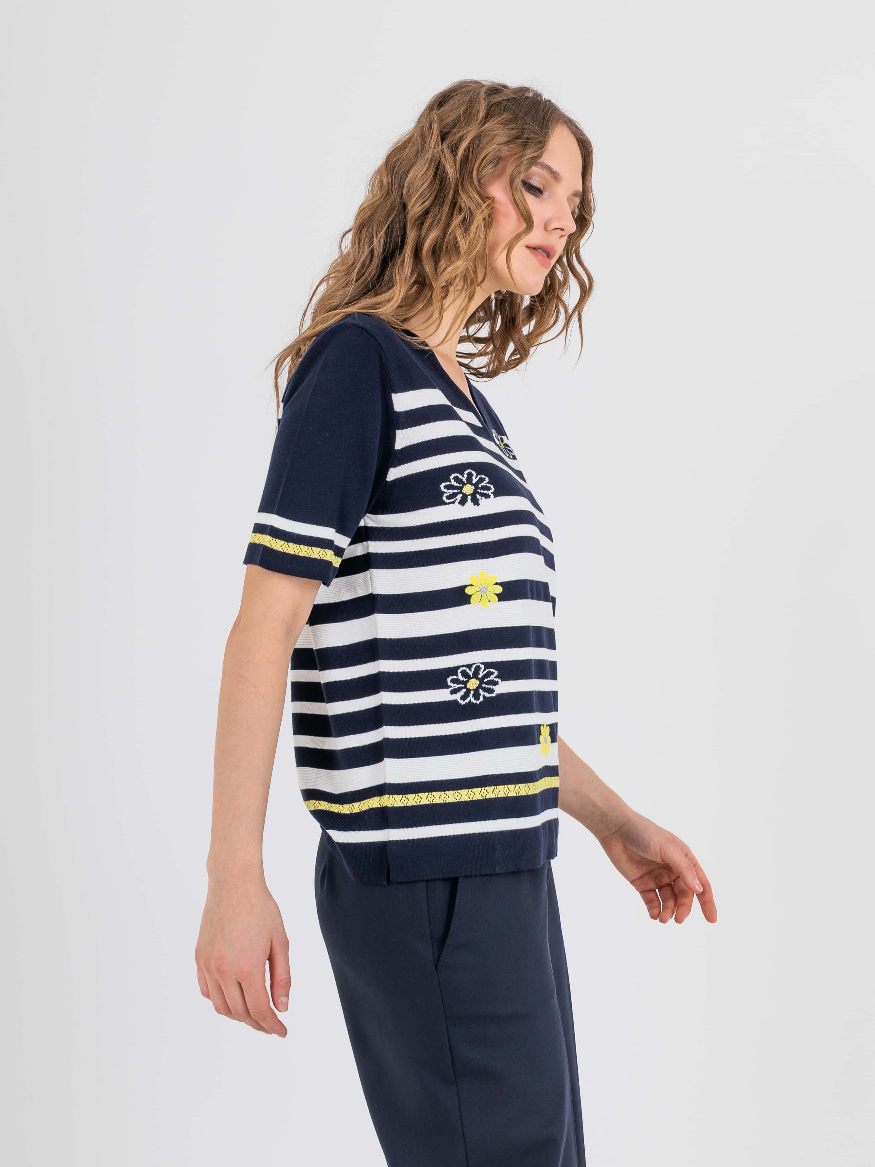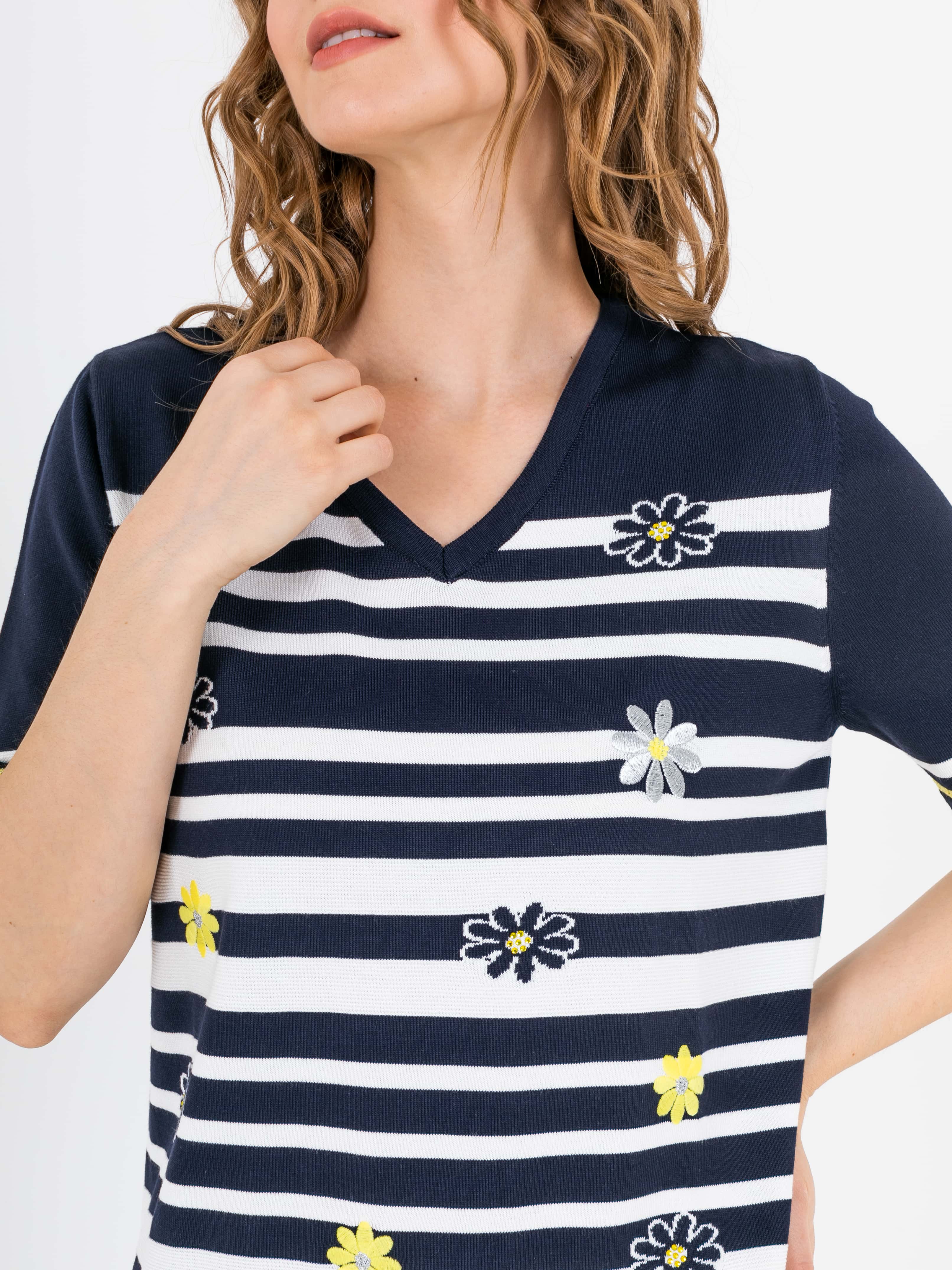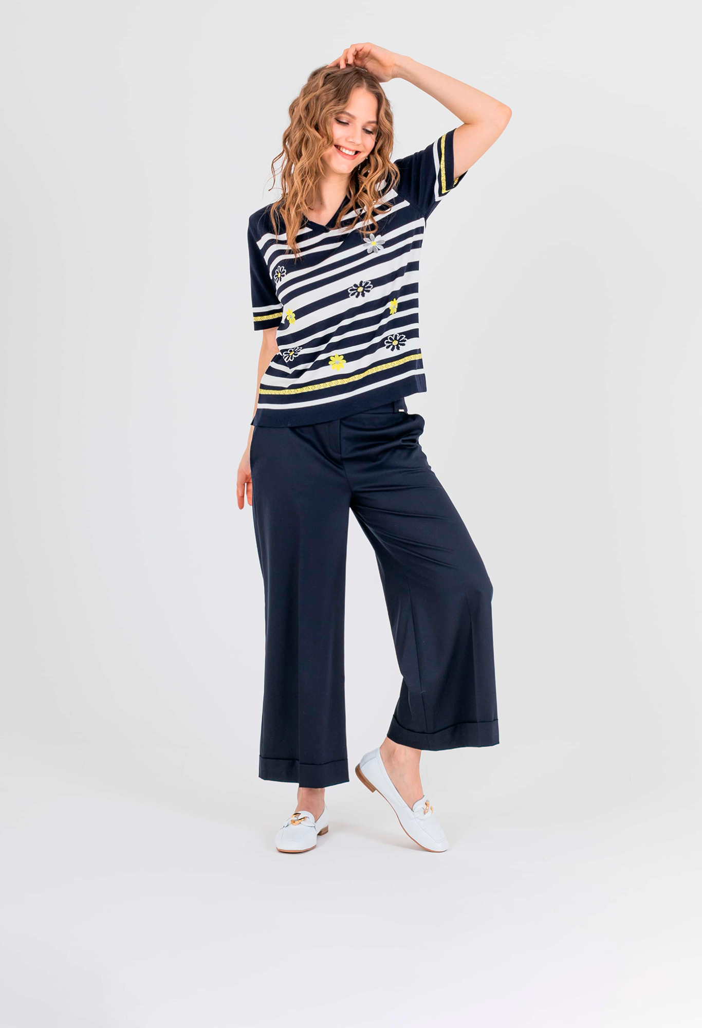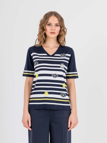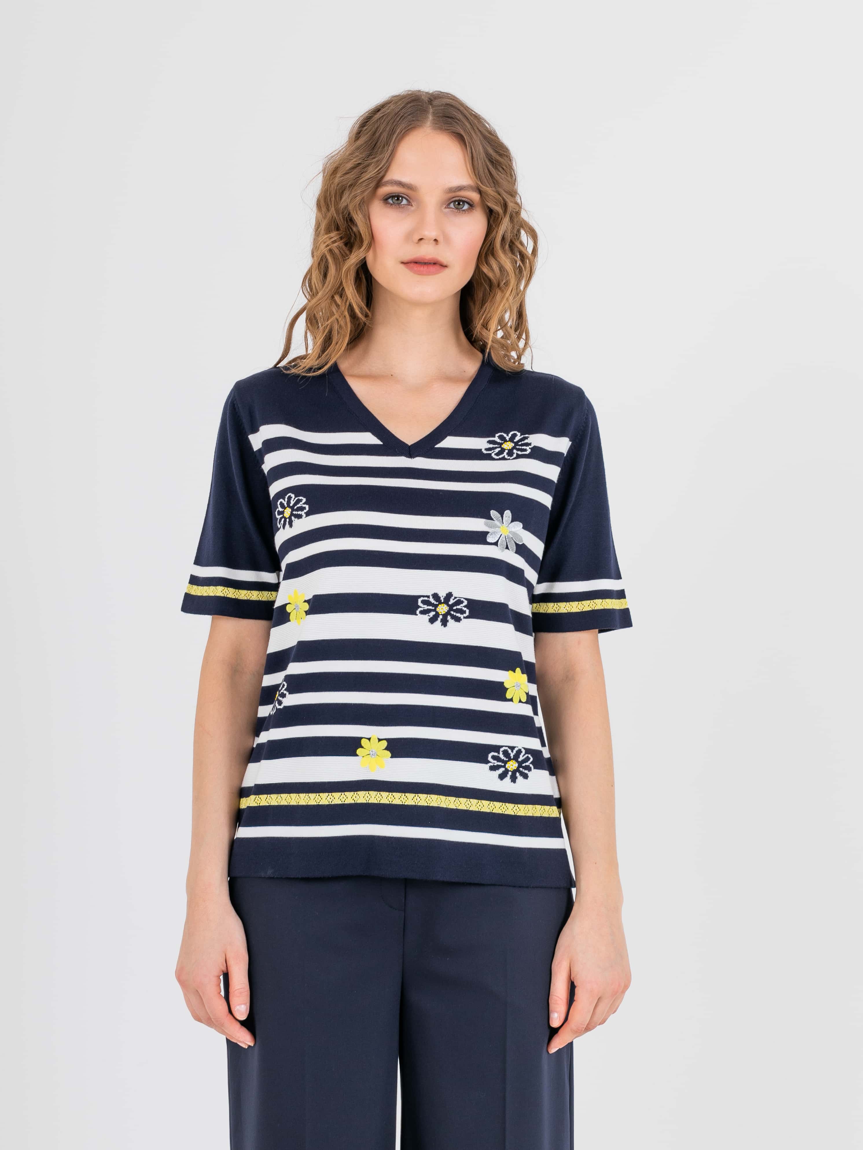 На сайте указаны российские размеры. Джемпер средней длины прямого силуэта из легкой, мягкой вискозы с добавлением люрекса, дизайнерская особенность модели – ажурный трикотаж в полоску и цветочек. По переду вышивка в области груди в виде ромашки. На спинке выполнена аппликация из страз. Укороченные втачные рукава. V-образный вырез горловины, обработанный трикотажной косой бейкой.