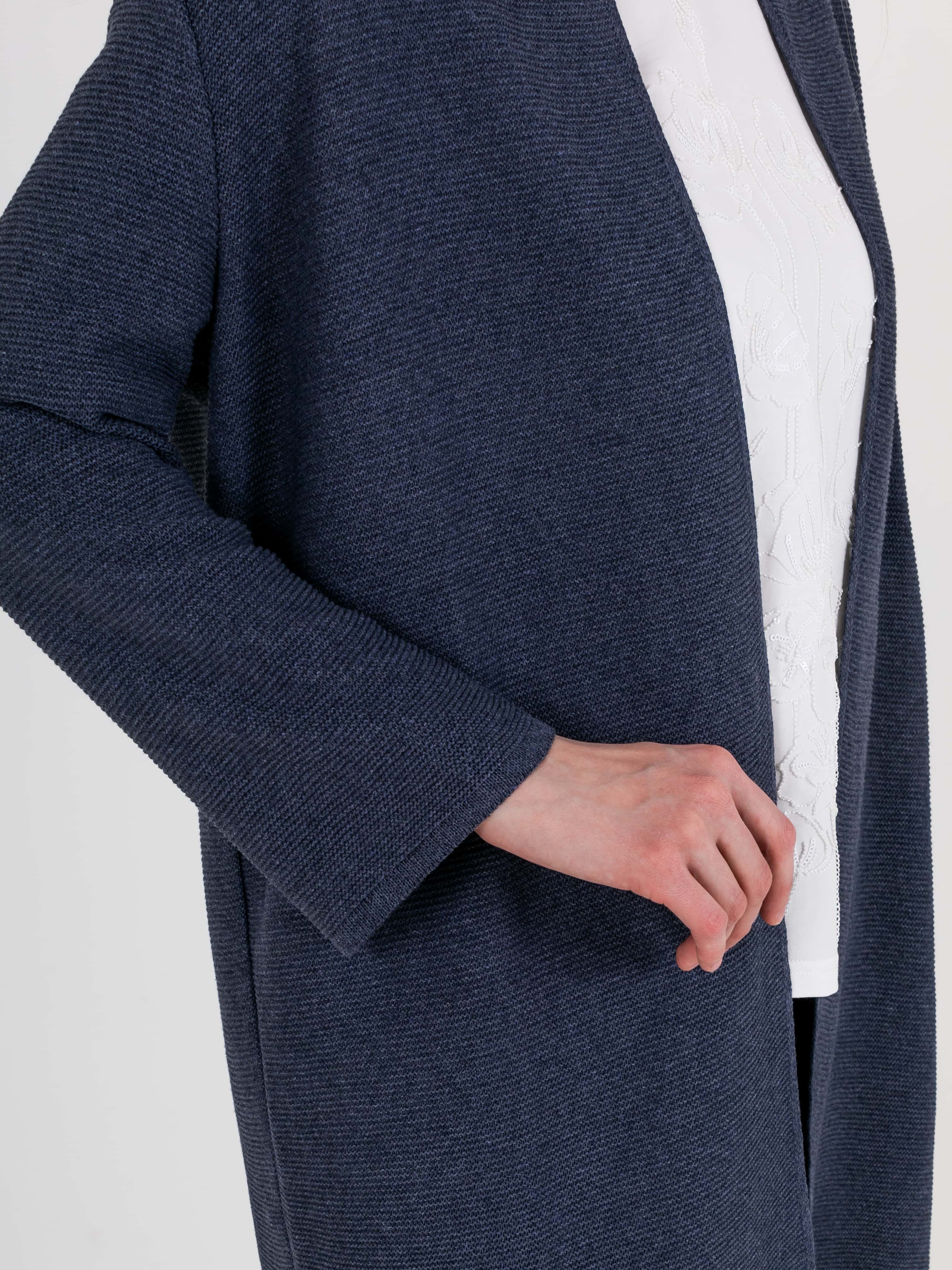 На сайте указаны российские размеры. Кардиган прямого силуэта длиной до середины бедер, из легкого хлопка с добавлением полиакрилонитрила. На спинке выполнен эффектный геометрический узор. Длинные втачные рукава со спущенной линией плеча. Горловина обработана небольшой стойкой.