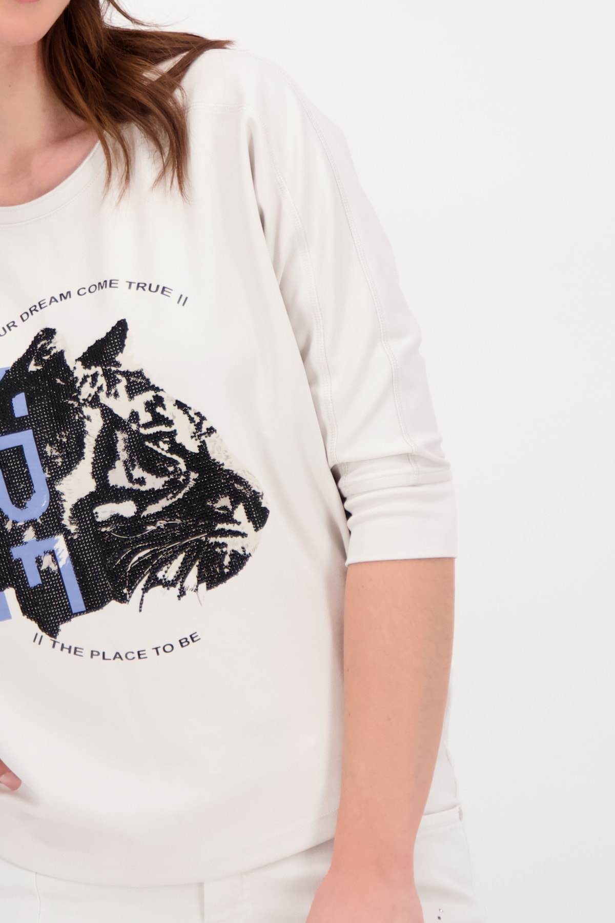 На сайте указаны российские размеры. Рубашка из джерси 3/4 с анималистичным принтом и стразами. Перед украшен крутым анималистическим принтом в виде головы тигра со сверкающими стразами и крутыми надписями. Блестящий оверлочный шов на круглом вырезе, на плече и вдоль длинных рукавов завершает дизайн женской рубашки. Закругленный низ и широкие манжеты на кромке рукава 3/4 не только гарантируют стильную деталь, но и удобную посадку, а струящаяся вискоза в миксе и эластичный материал также приятны для кожи. Длина по спинке 44 размера составляет 62 см. Модель ростом 179 см