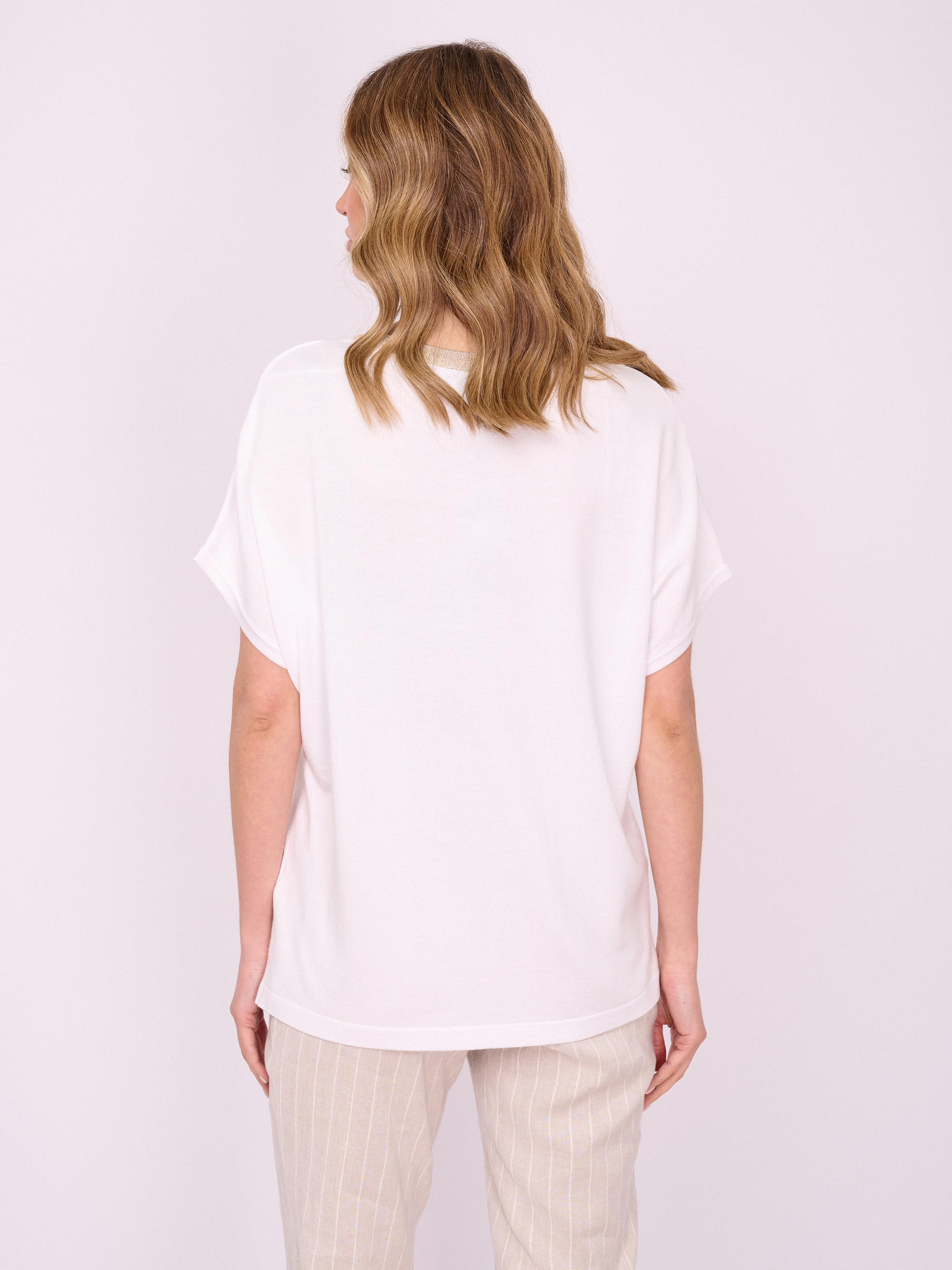 На сайте указаны российские размеры. Трикотажный прямой белый пуловер с V-образным вырезом, с коротким рукавом, с золотистыми вставками и с золотистым цветочным рисунком, с декоративными пуговицами и стразами. Длина по спинке: 63 см. Рост модели: 175 см.