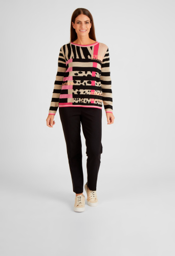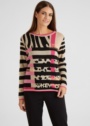 На сайте указаны российские размеры. Вязаный свитер с длинными рукавами впечатляет своим экзотическим видом. Принт спереди состоит из сочетания леопардового принта и надписей. Вязаный джемпер — настоящий талант комбинаций, он хорошо сочетается как с юбкой, так и с брюками. Длина по спинке от плеча для размера 46: 62 см. Рост модели 176 см.