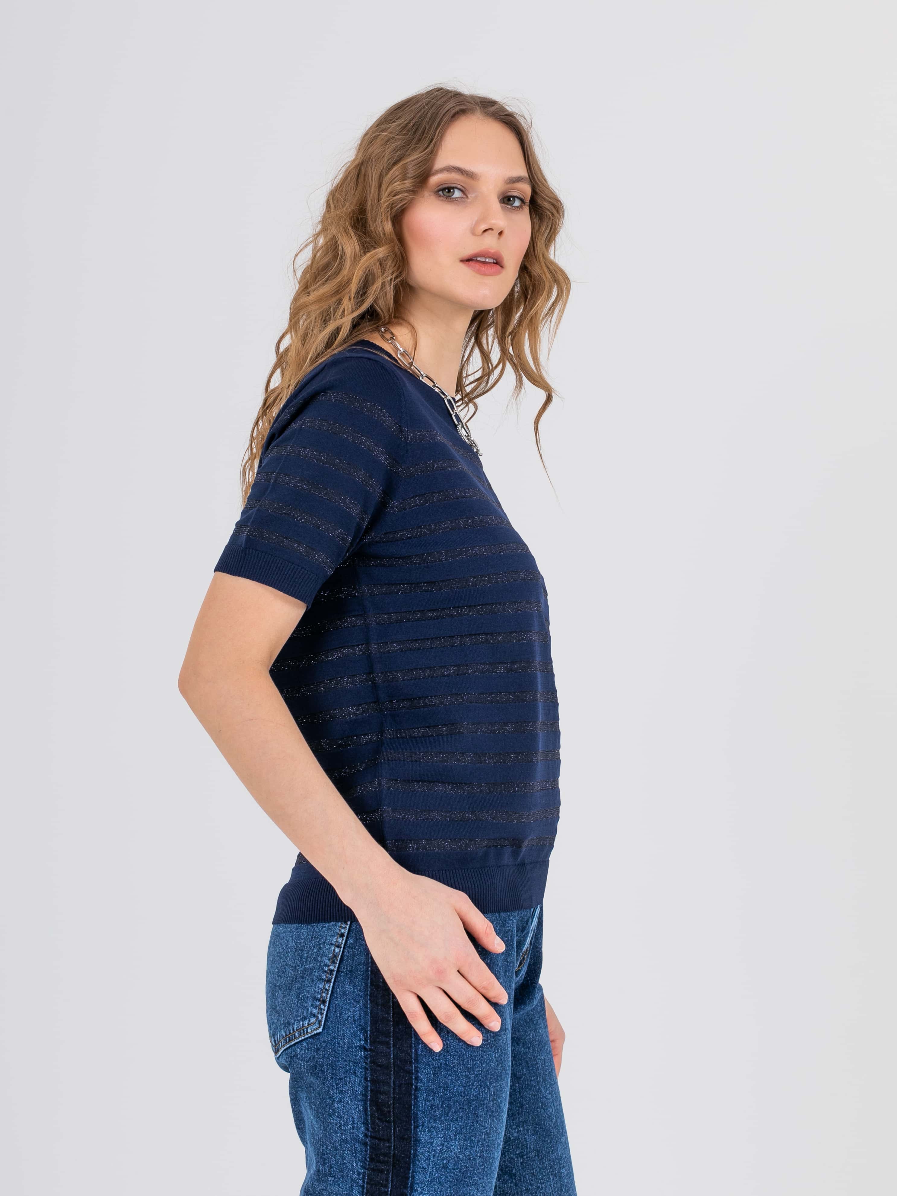 Укороченная футболка прямого силуэта в полоску из легкой, мягкой вискозы с добавлением эластана. Перед и спинка по низу обработаны манжетой. Укороченные втачные рукава с манжетами. Круглый вырез горловины, обработанный трикотажной косой бейкой.