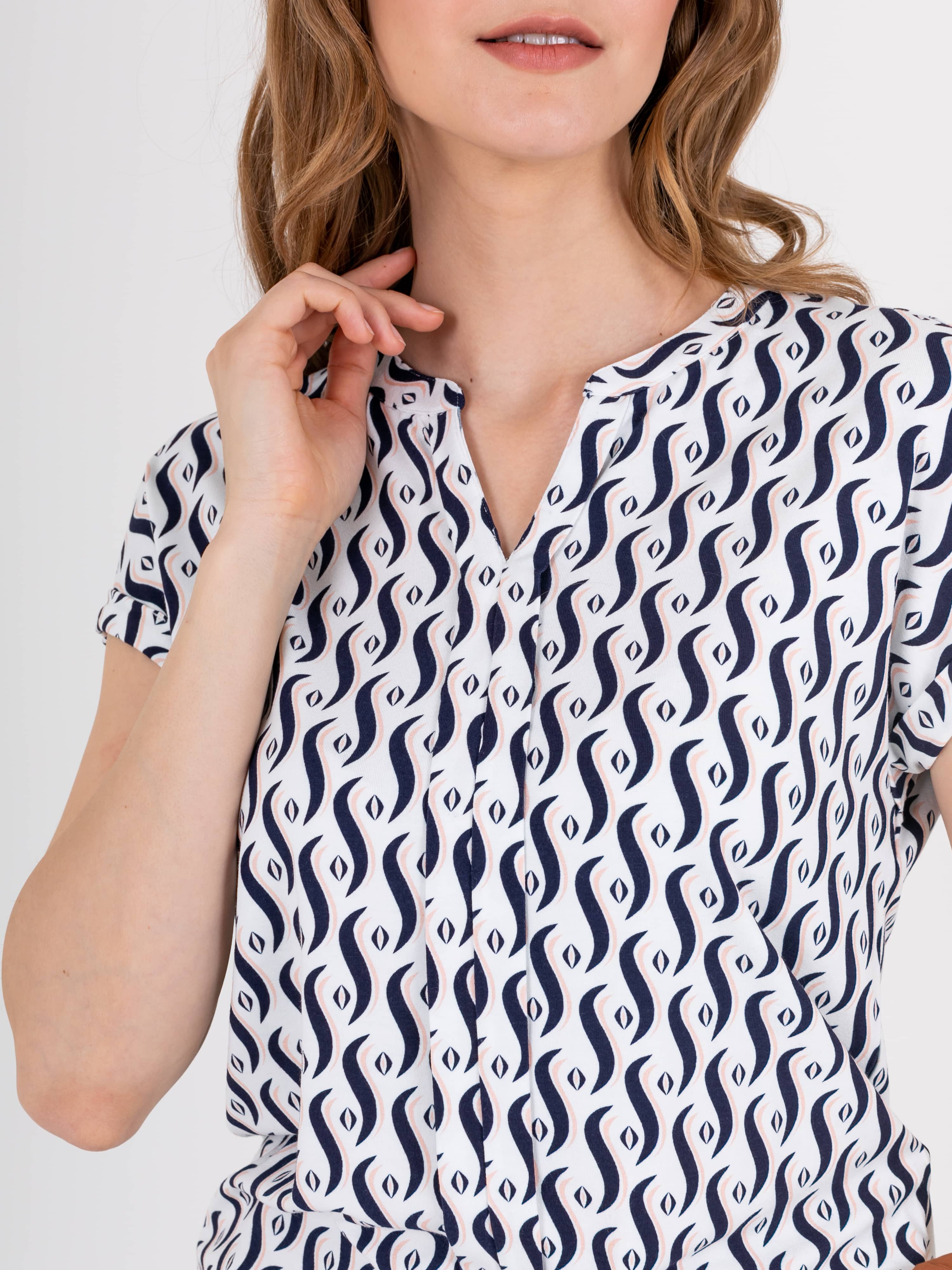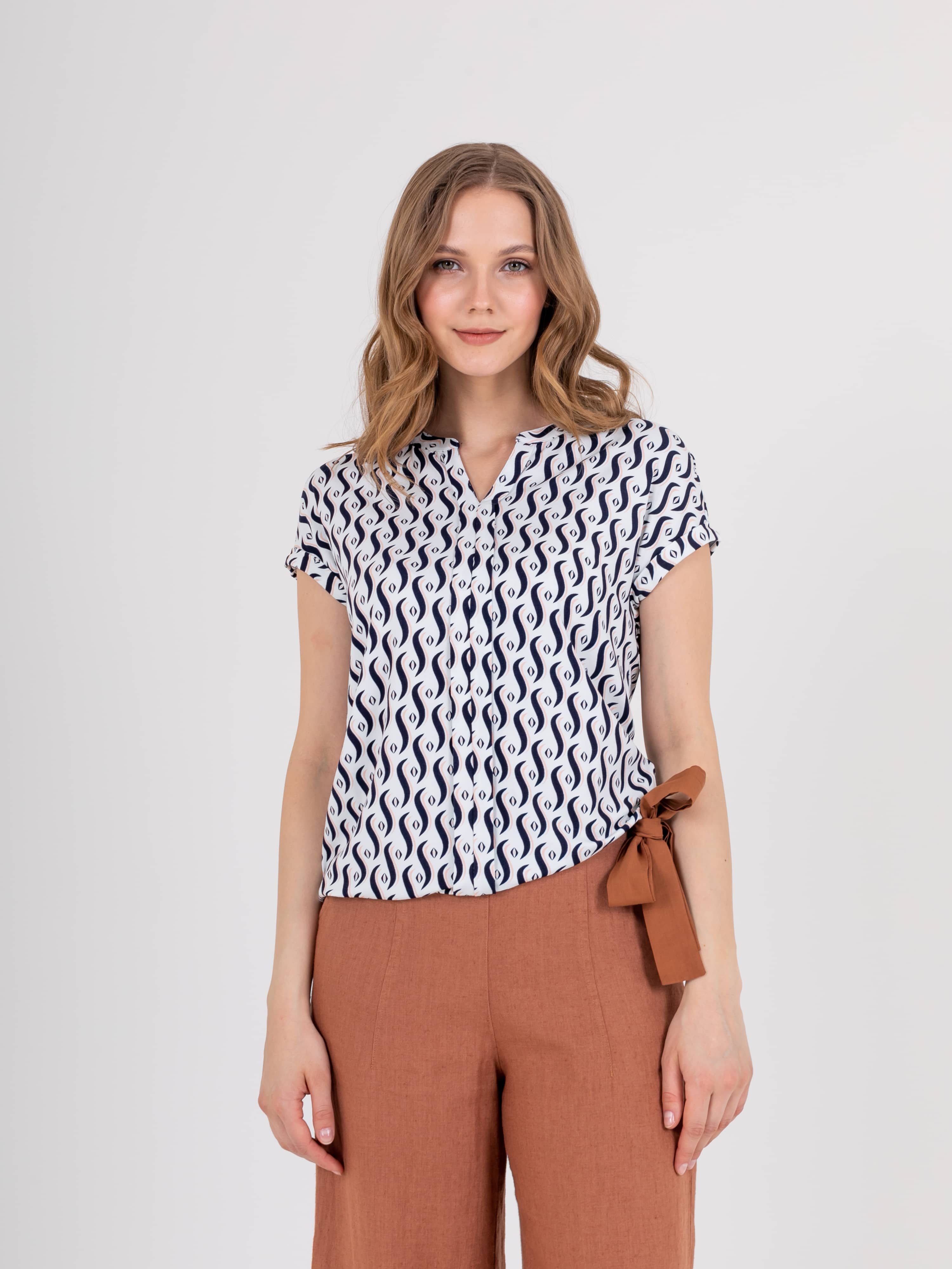 Футболка средней длины прямого силуэта из легкой, мягкой вискозы с добавлением эластана, дизайнерская особенность модели – яркий принт. Короткие цельнокроеные рукава с манжетами. Круглый вырез горловины с разрезом, обработан косой бейкой, которая переходит в декоративную планку по переду.