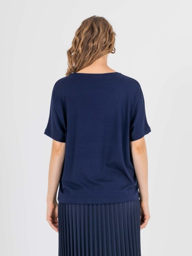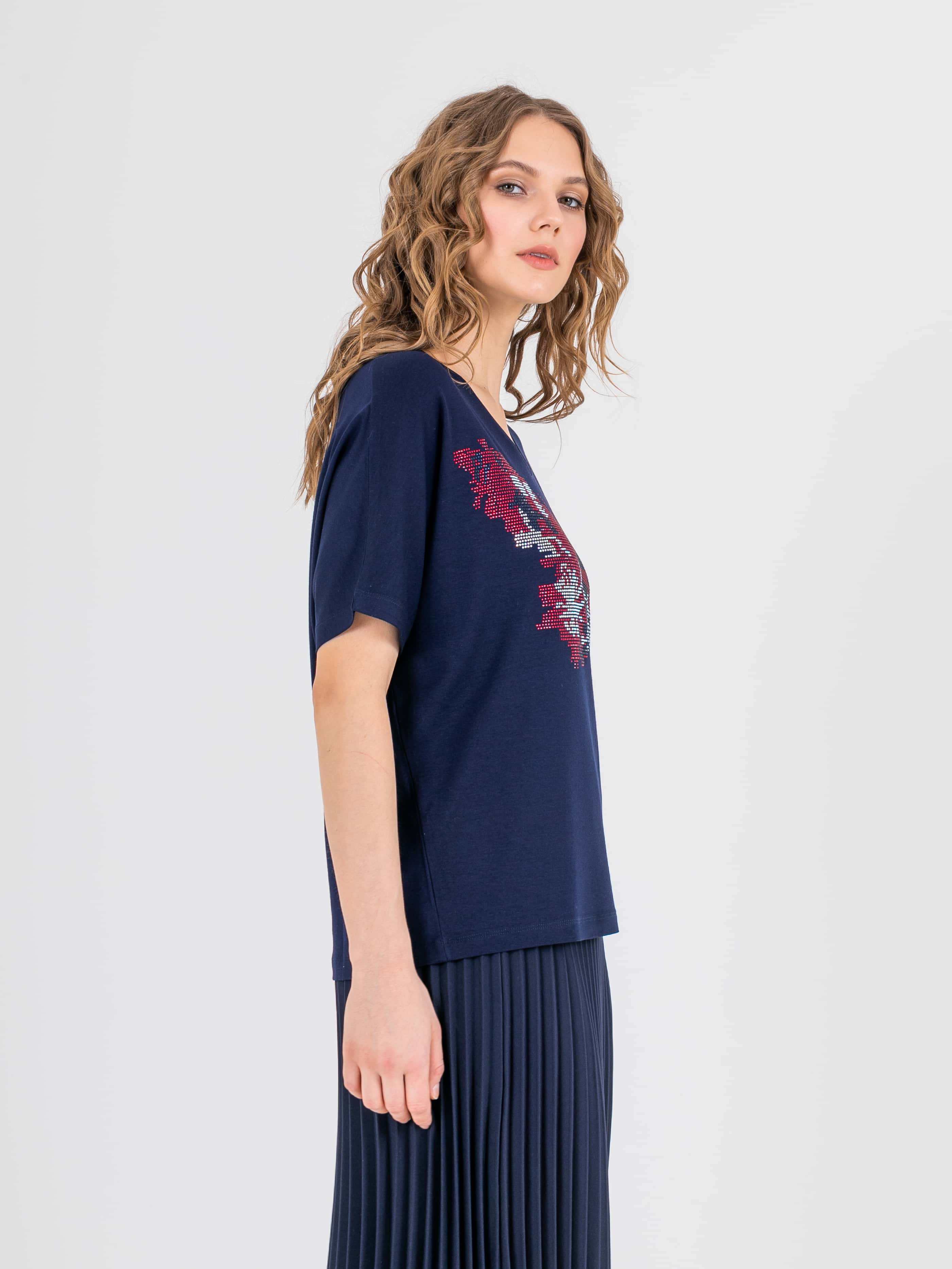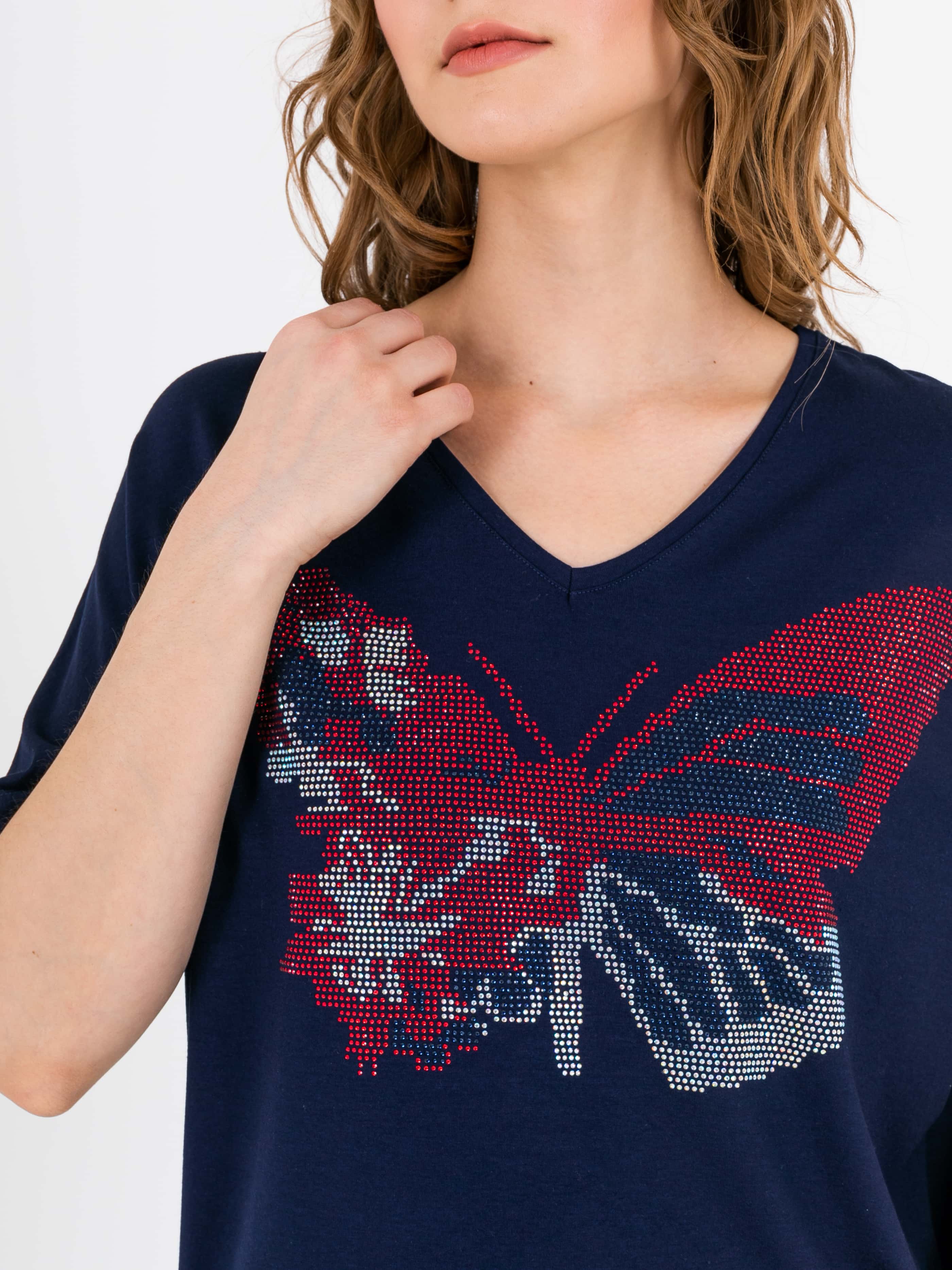 На сайте указаны российские размеры. Оверсайз футболка средней длины прямого силуэта из легкой, мягкой вискозы с добавлением эластана. По переду выполнена яркая аппликация из страз. Укороченные цельнокроеные рукава. V-образный вырез горловины, обработанный трикотажной косой бейкой.