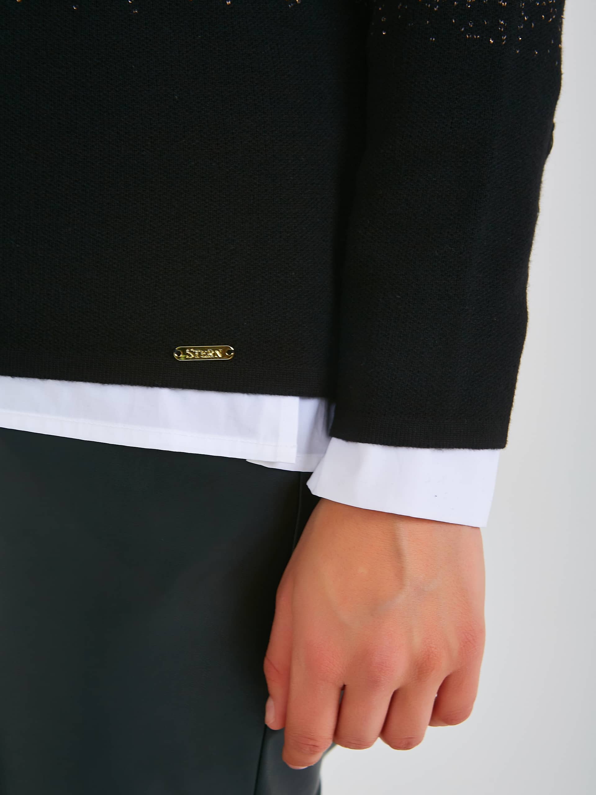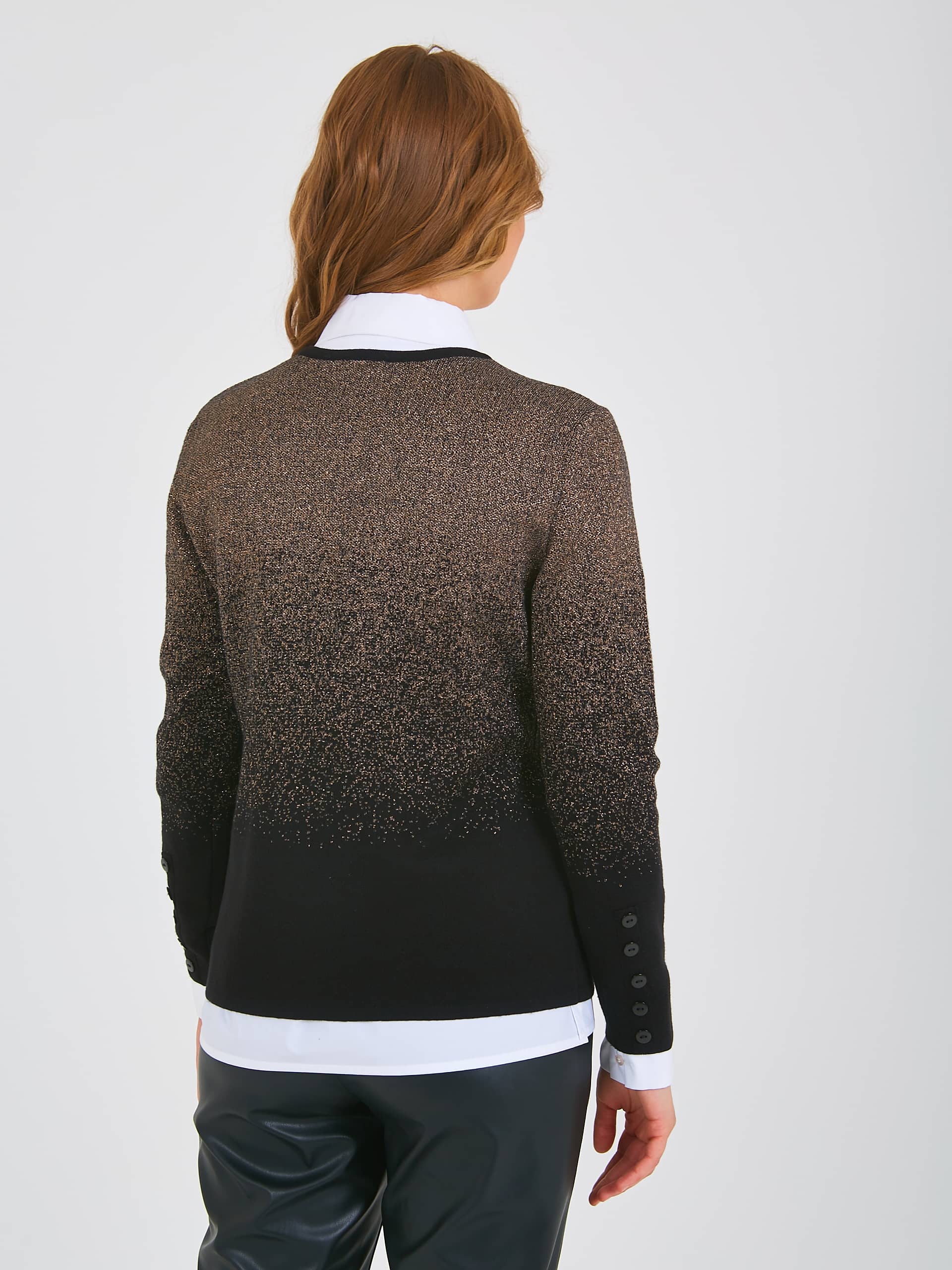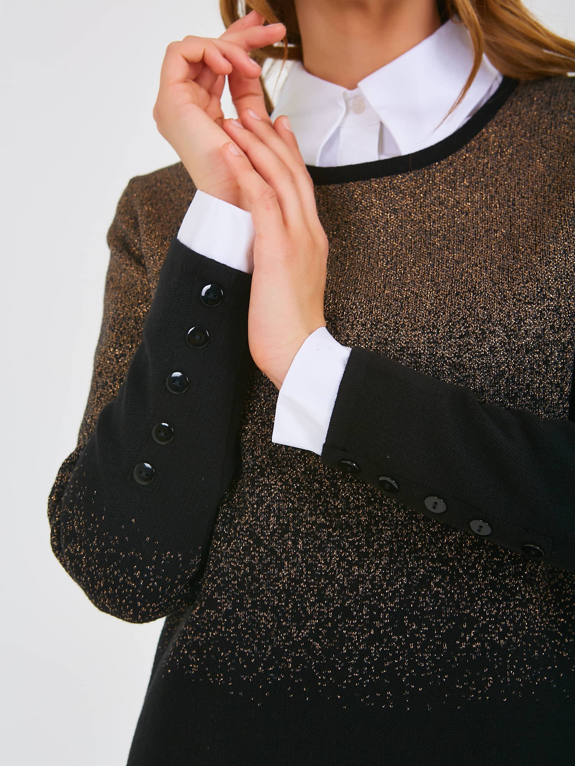 Джемпер средней длины прямого силуэта из легкого хлопка с добавлением акрила и люрекса, дизайнерская особенность модели – рисунок из нитей люрекса в виде градиента. Длинные втачные рукава с имитацией шлицы и 5 декоративными пуговицами. Круглый вырез горловины.