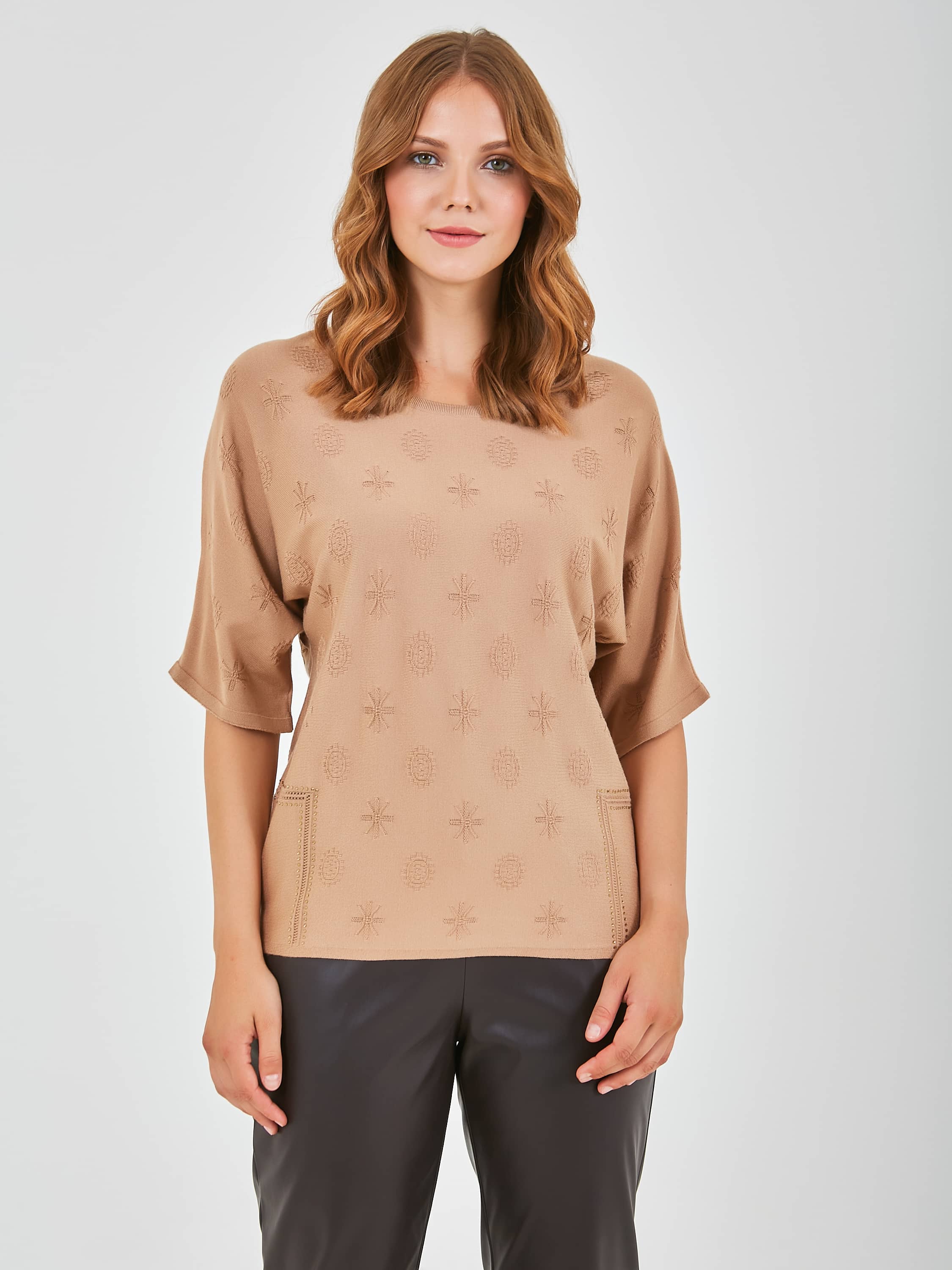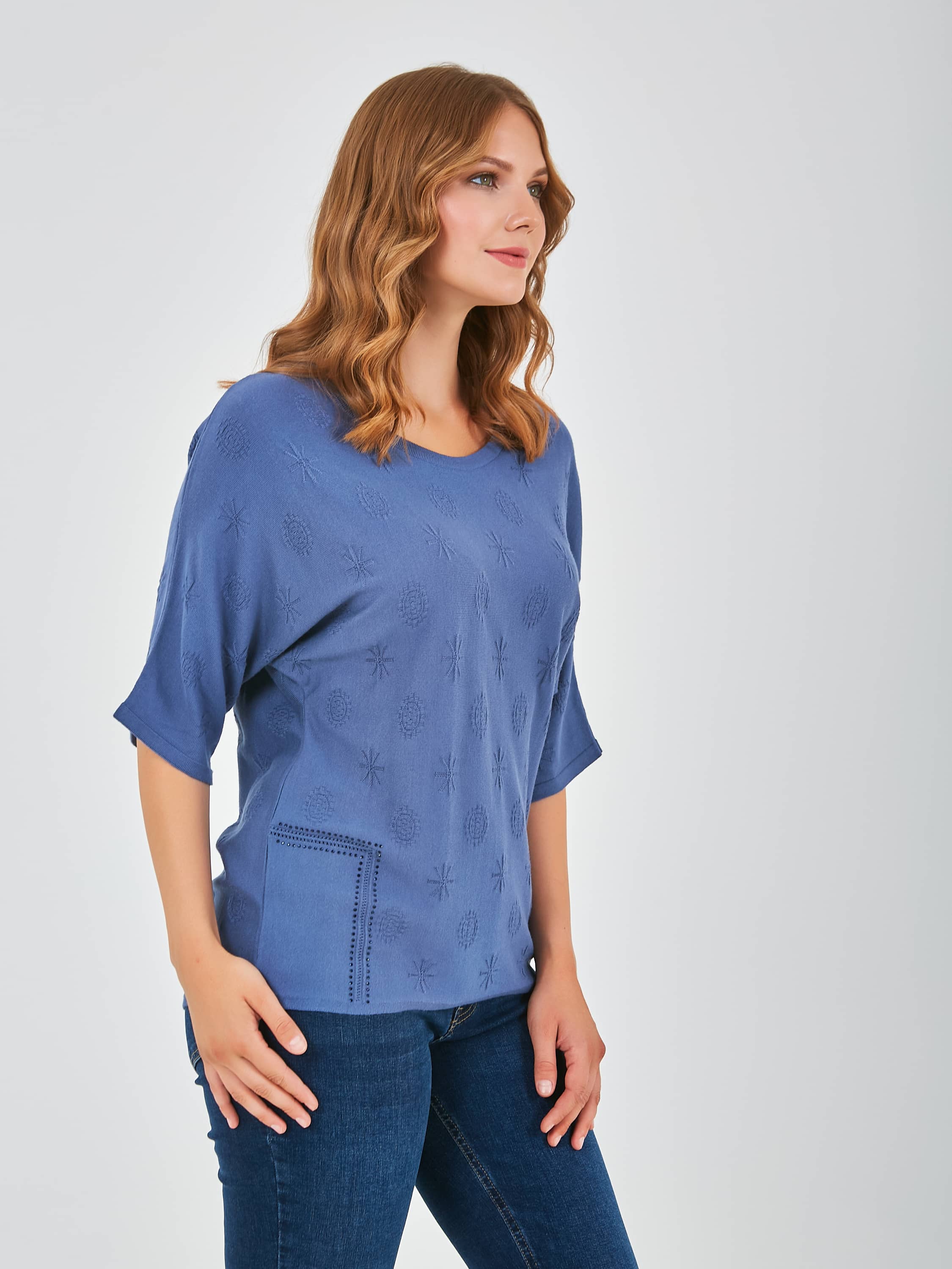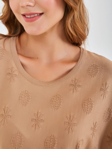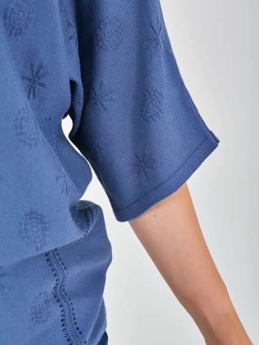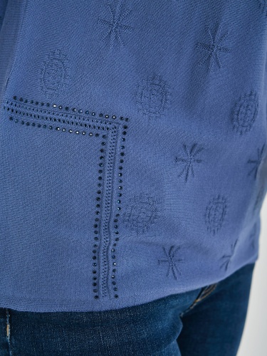 Джемпер средней длины прямого силуэта из мягкой вискозы с добавлением эластана, дизайнерская особенность модели – ажурный трикотаж с имитацией карманов и стразами. Цельнокроеные рукава до локтя. Круглый вырез горловины.