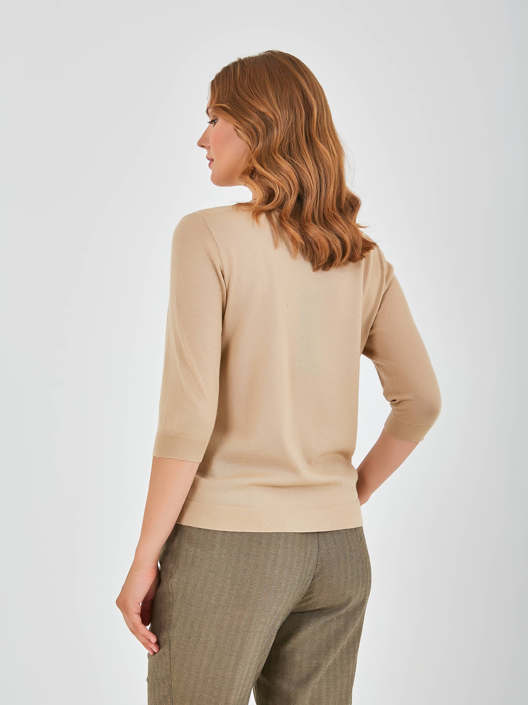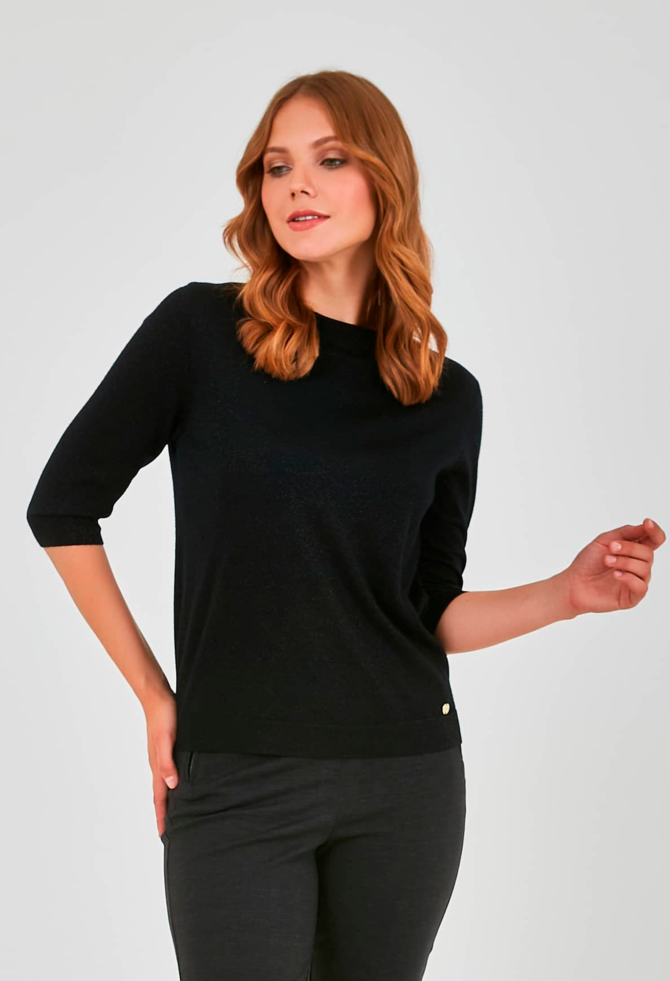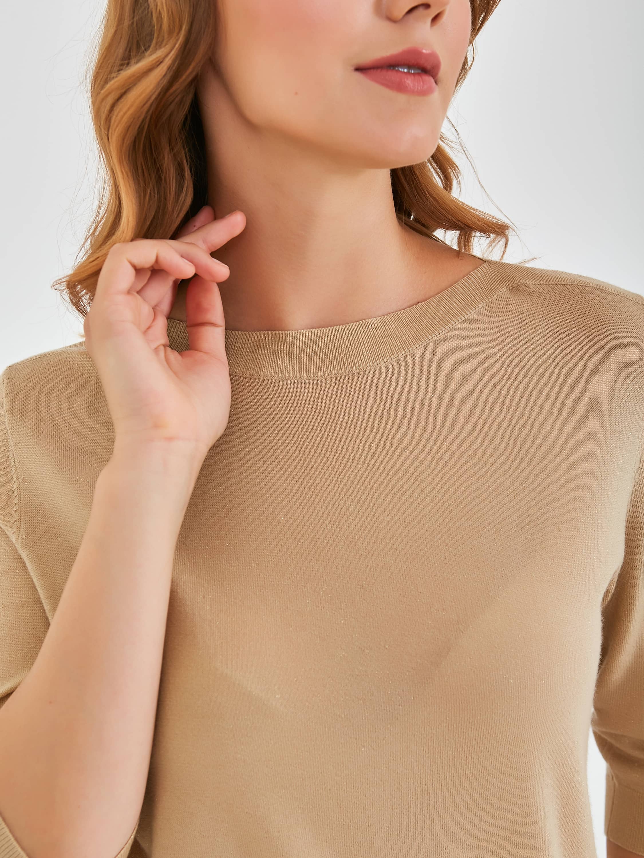 Джемпер средней длины прямого силуэта из мягкой шерсти с добавлением нейлона и люрекса. Перед и спинка по низу обработаны манжетой. Втачные рукава 3/4 с манжетами. Круглый вырез горловины.