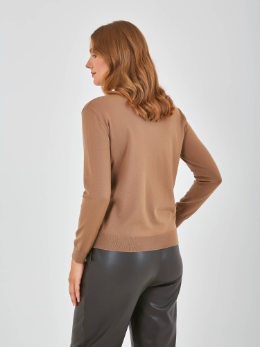 Джемпер средней длины прямого силуэта из акрила с добавлением тенсела и мягкой шерсти. Перед и спинка по низу обработаны манжетой. Длинные втачные рукава с манжетами. Воротник «гольф».