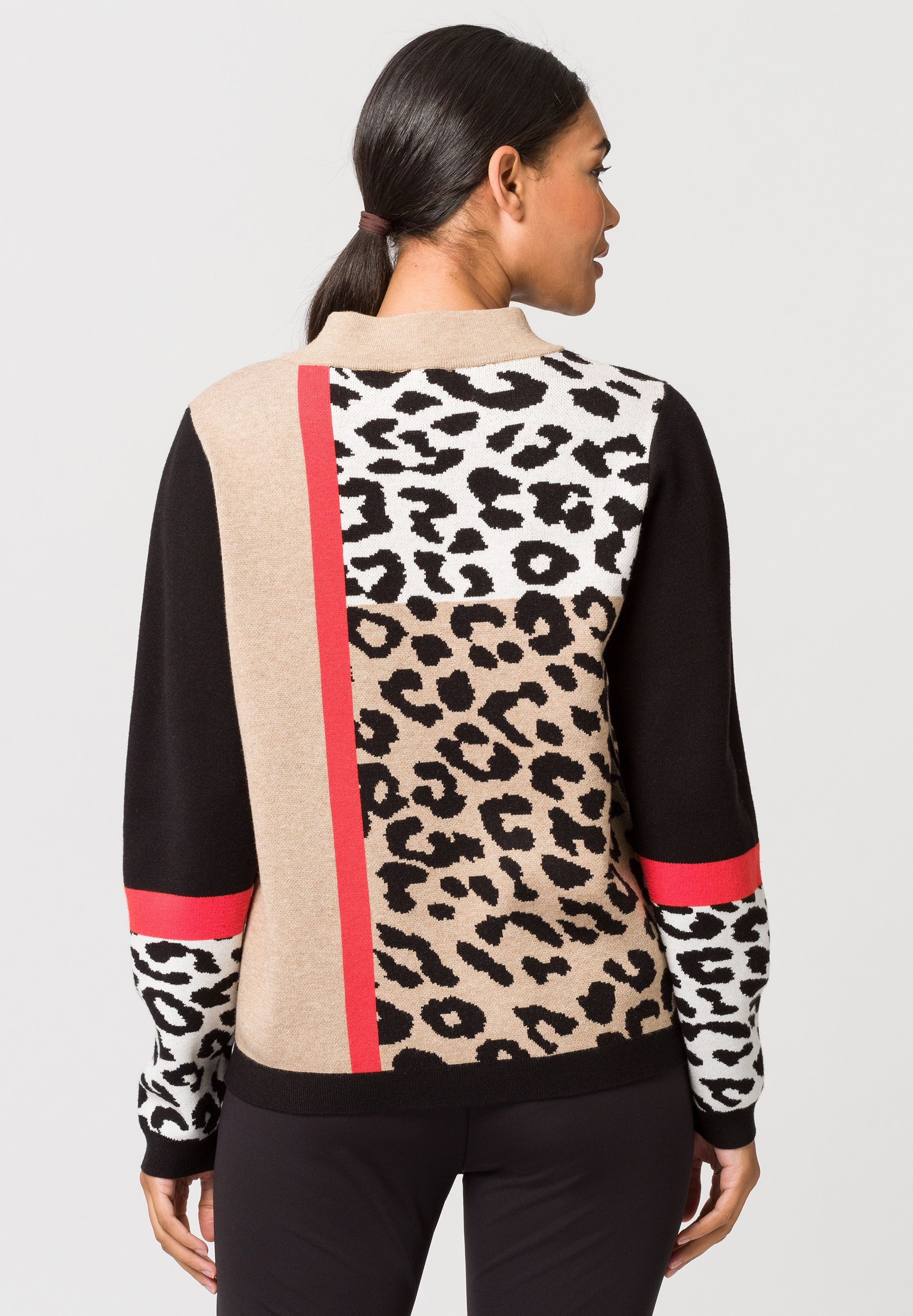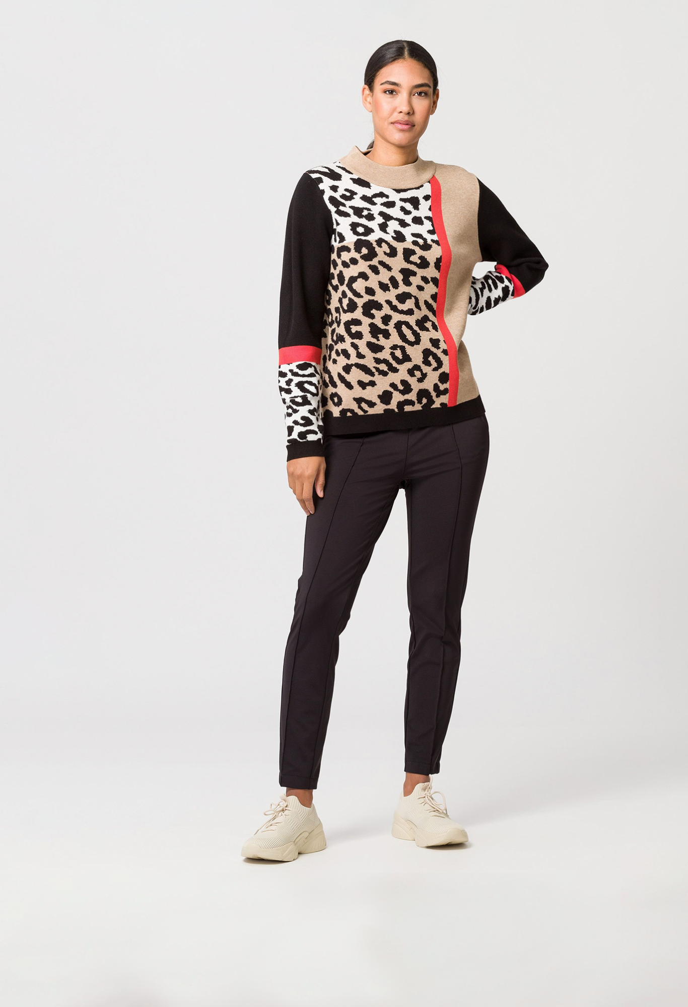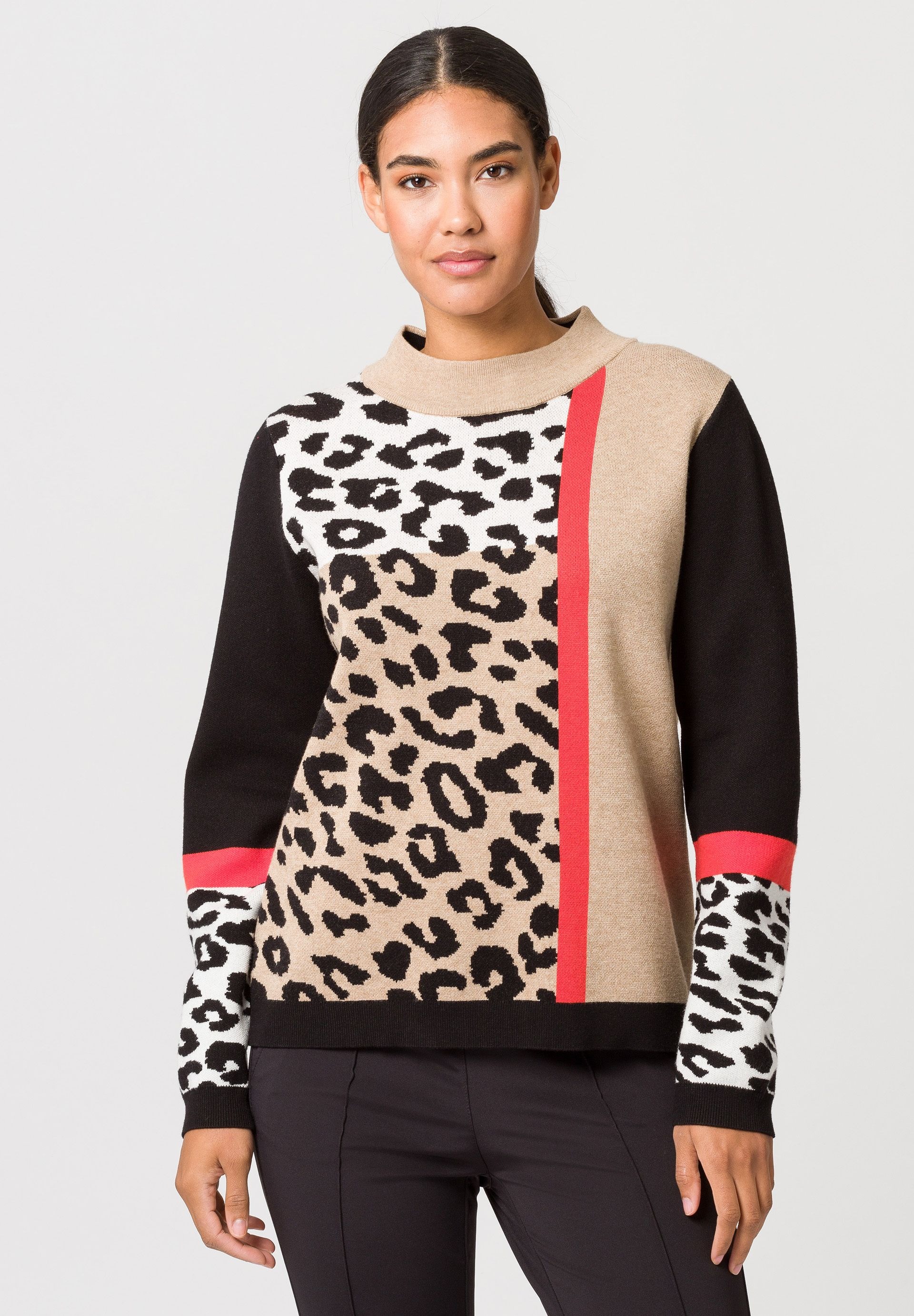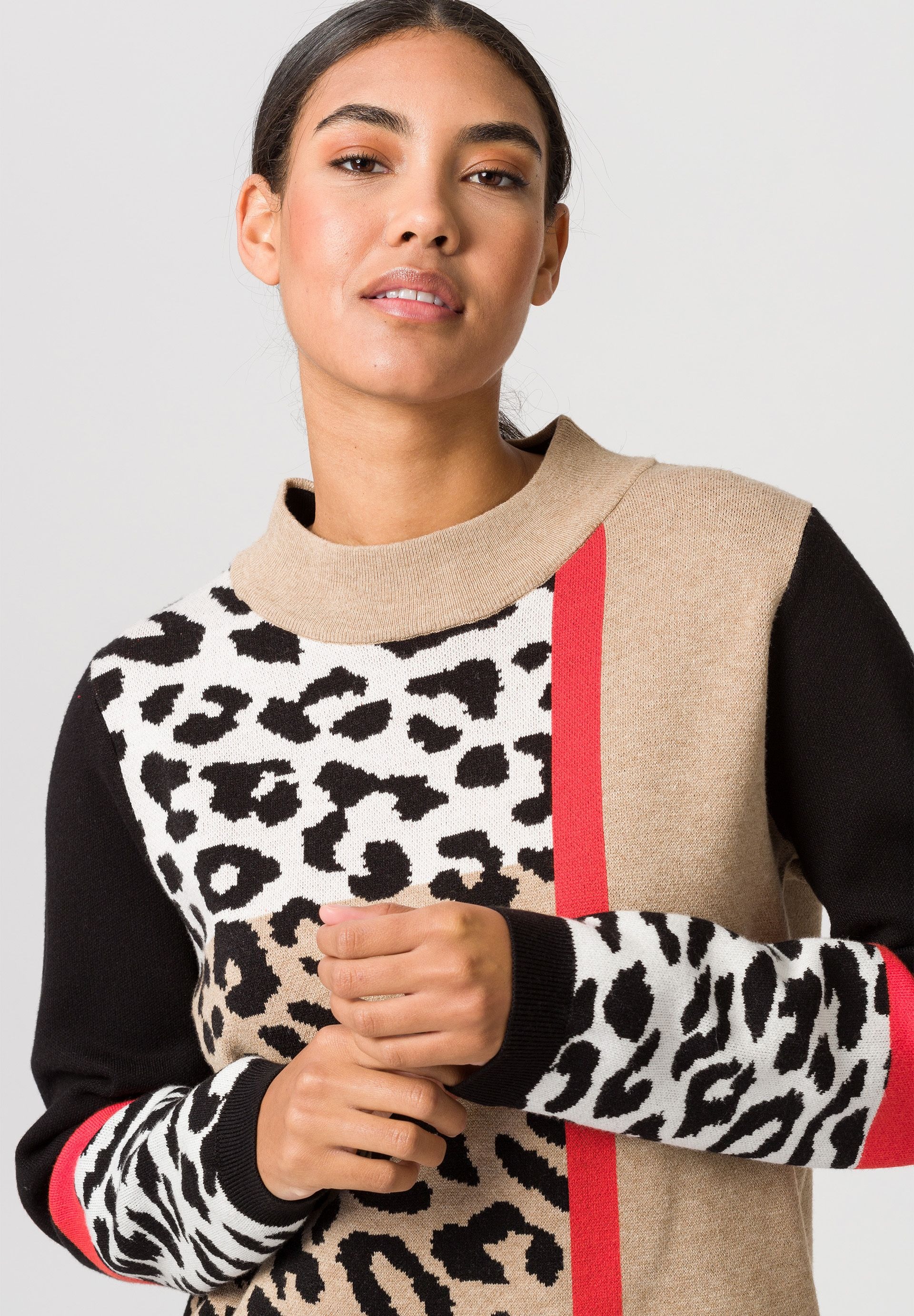 Цветовые блоки и животные узоры делают этот вязаный свитер особенно интересным. Помимо красочного магнитного внешнего вида, свитер также вписывается в повседневную модную жизнь благодаря своим отличным износостойким свойствам. Оно не только удобного кроя, но и изготовлено из мягкого тонкого трикотажа с высоким содержанием вискозы. Уютный и стильный – этот свитер впечатляет во всех отношениях. Облегающий фигуру крой, мягкий, тонкий трикотаж с высоким содержанием вискозы. Тонкий ребристый воротник-стойка. Слегка нахлест плечевых швов. Ребристые манжеты