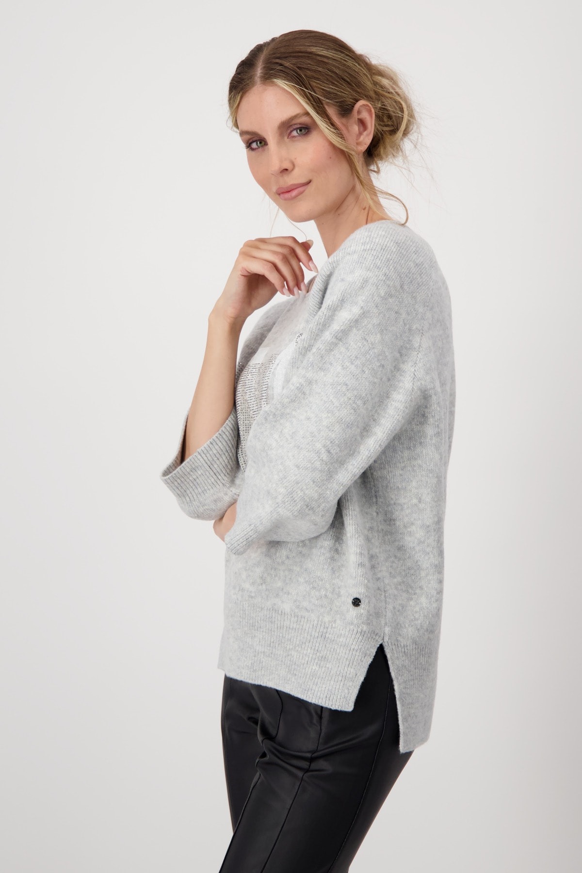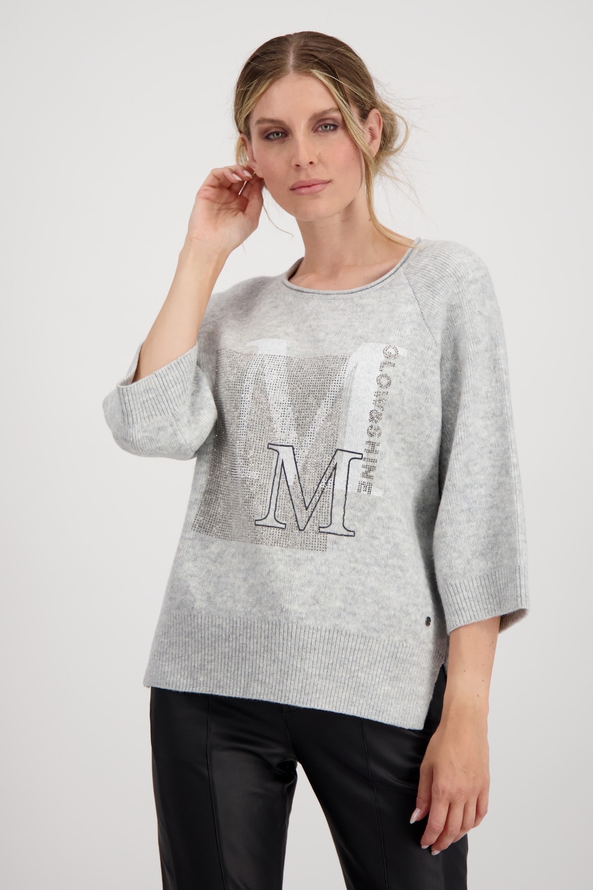 Свитер впечатляет очень мягкой поверхностью и большим прямоугольником из стразов с буквами и дополнительной надписью из стразов спереди. Круглый вырез горловины с закругленным краем. Рукава реглан 3/4. Ребристые рукава и низ корпуса. Удлиненная спинка с разрезами по бокам. Длина 44 размера по спинке составляет 65 см, длина по переду - 61 см.