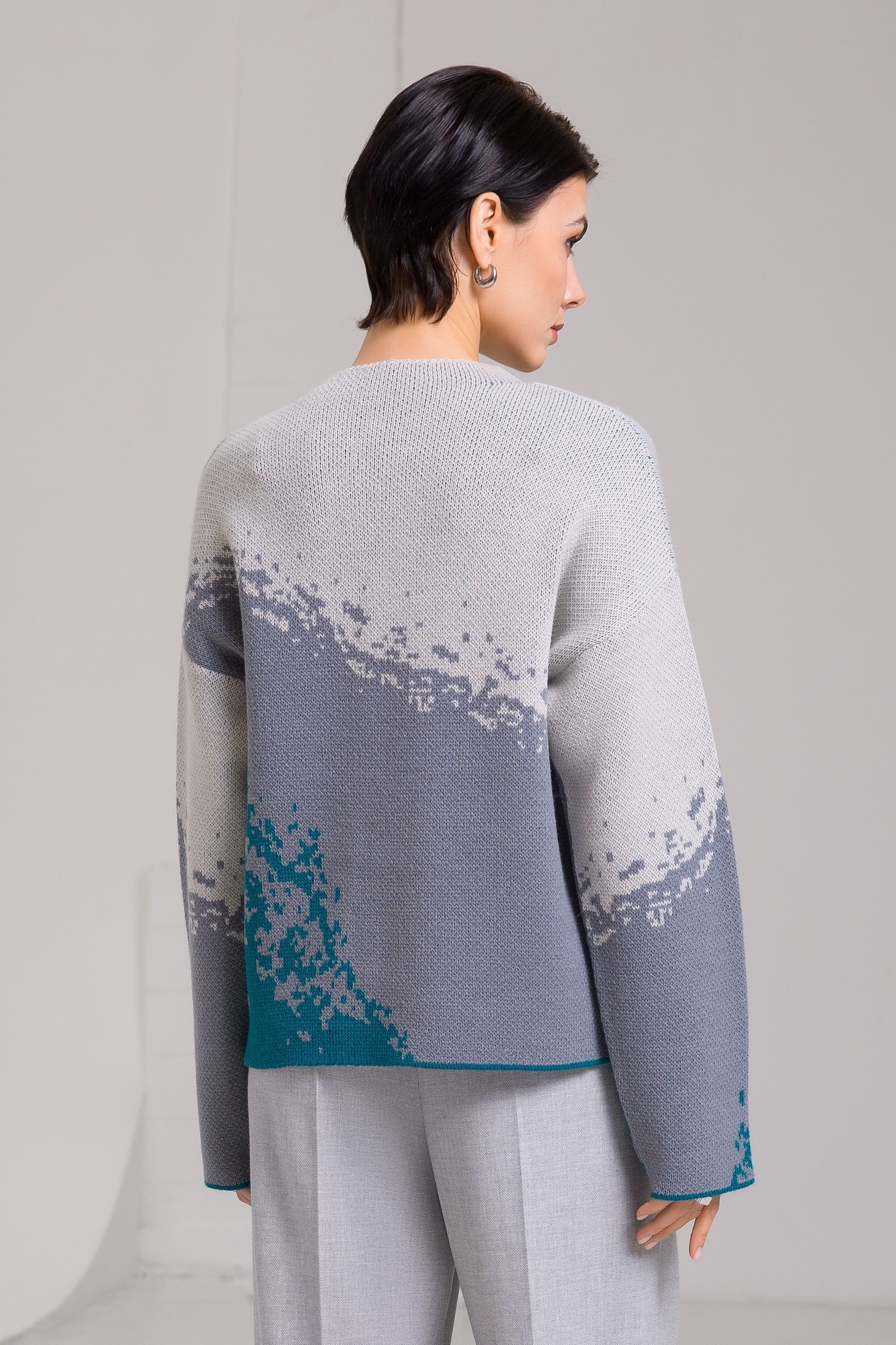 Оригинальный пуловер в технике неполного жаккарда выполнен из сияющего сочетания глубоких зеленых и серых оттенков.
