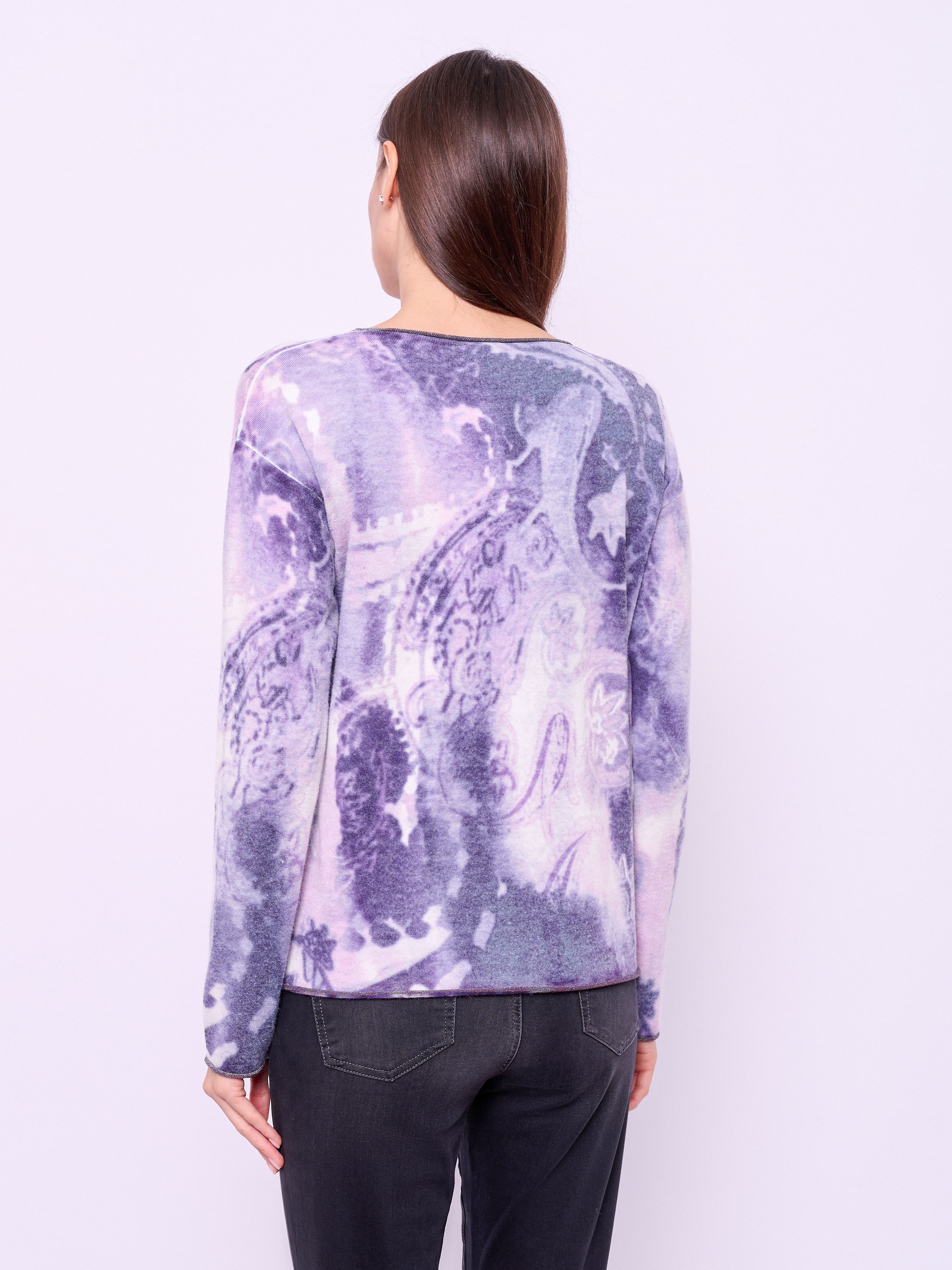Детали: вырез горловины округлый, рукава длинные, покрой прямой, рисунок абстракция, серебристый принт. Длина по спинке: 58 см.
