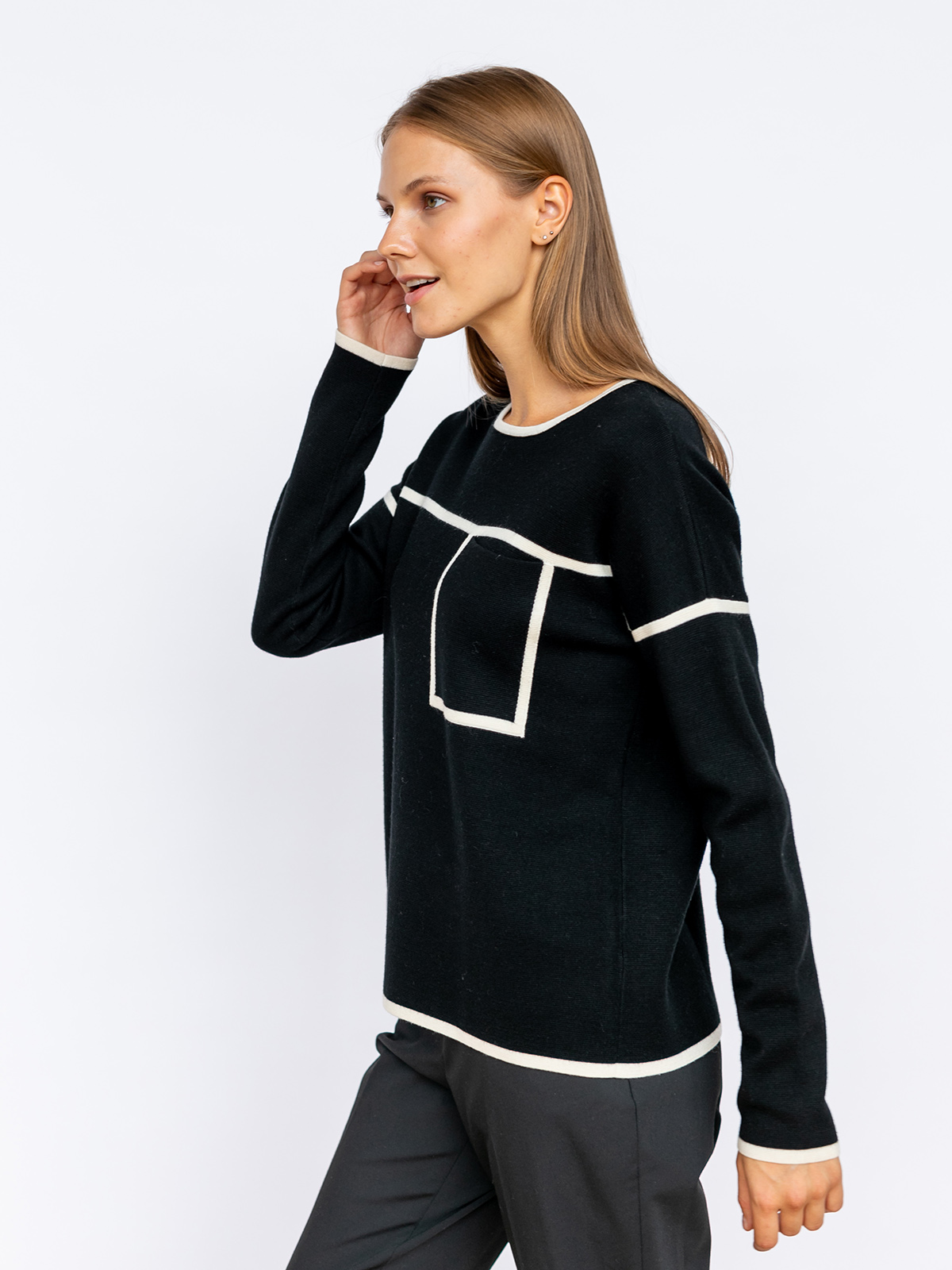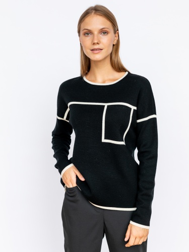 Однотонный джемпер с контрастными линиями – оригинальный дизайн для образов в стиле кэжуал. Вырез горловины лодочка, длинный втачной рукав, спущенная линия плеч. Накладной карман на груди. Джемпер из 100% шерсти приятен к телу и хорошо сохраняет тепло. Предпочтительно носить навыпуск с джинсами, брюками или юбкой длиной миди.